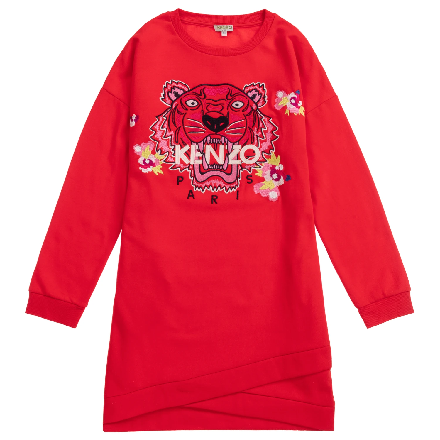 Comfortable red cotton sweatshirt fleece dress by Kenzo Kids with the icon Tiger and Japanese flower embroidery. This casual dress fits just above the knee, it has a cross-over hemline and useful consealed pockets on the side.