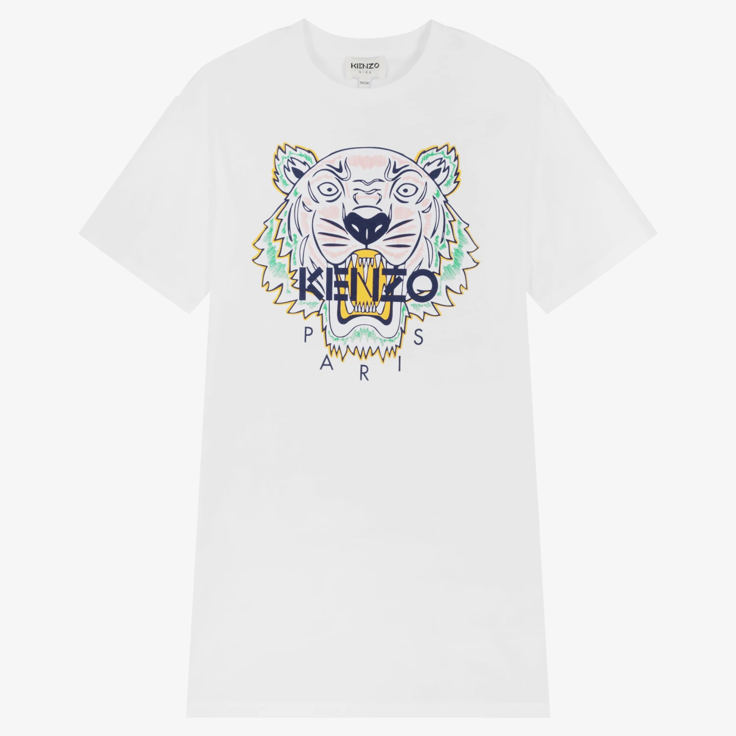 Stylish white dress for teen girls by KENZO KIDS, with the designer’s iconic colourful Tiger logo print on the front. This comfortable T-shirt dress is made in super soft organic cotton jersey.