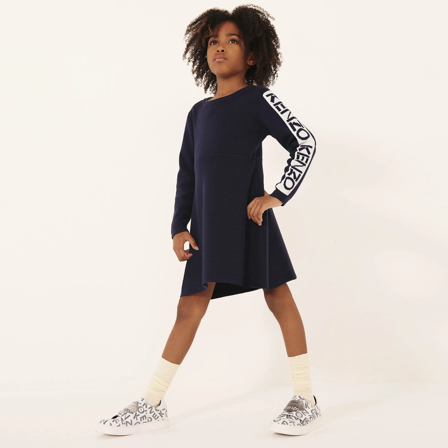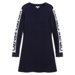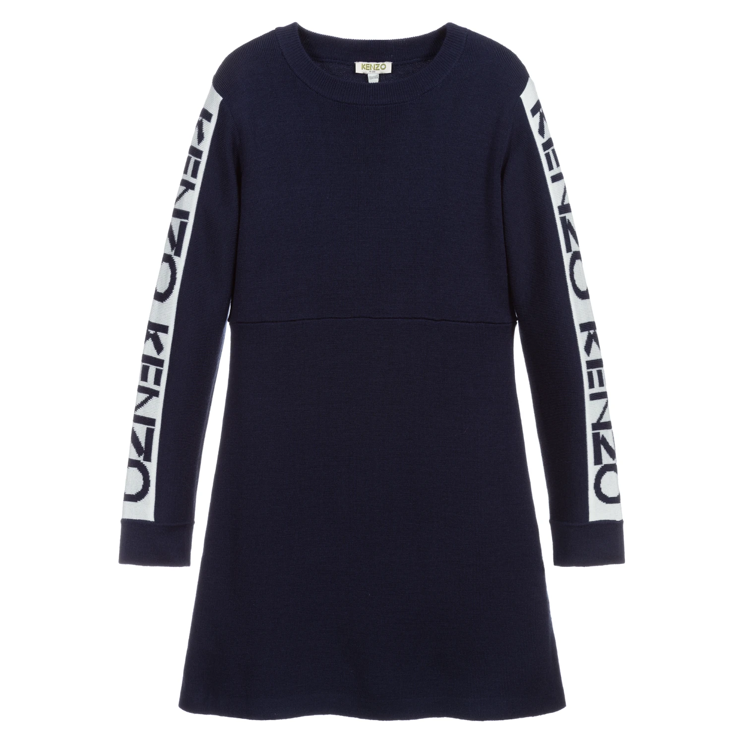 Teen girls navy blue Kenzo Kids dress knitted in a soft and lightweight wool blend. It has of-white stripes on the sleeves with navy blue logos. Easy to wear, it simply slips on over the head.