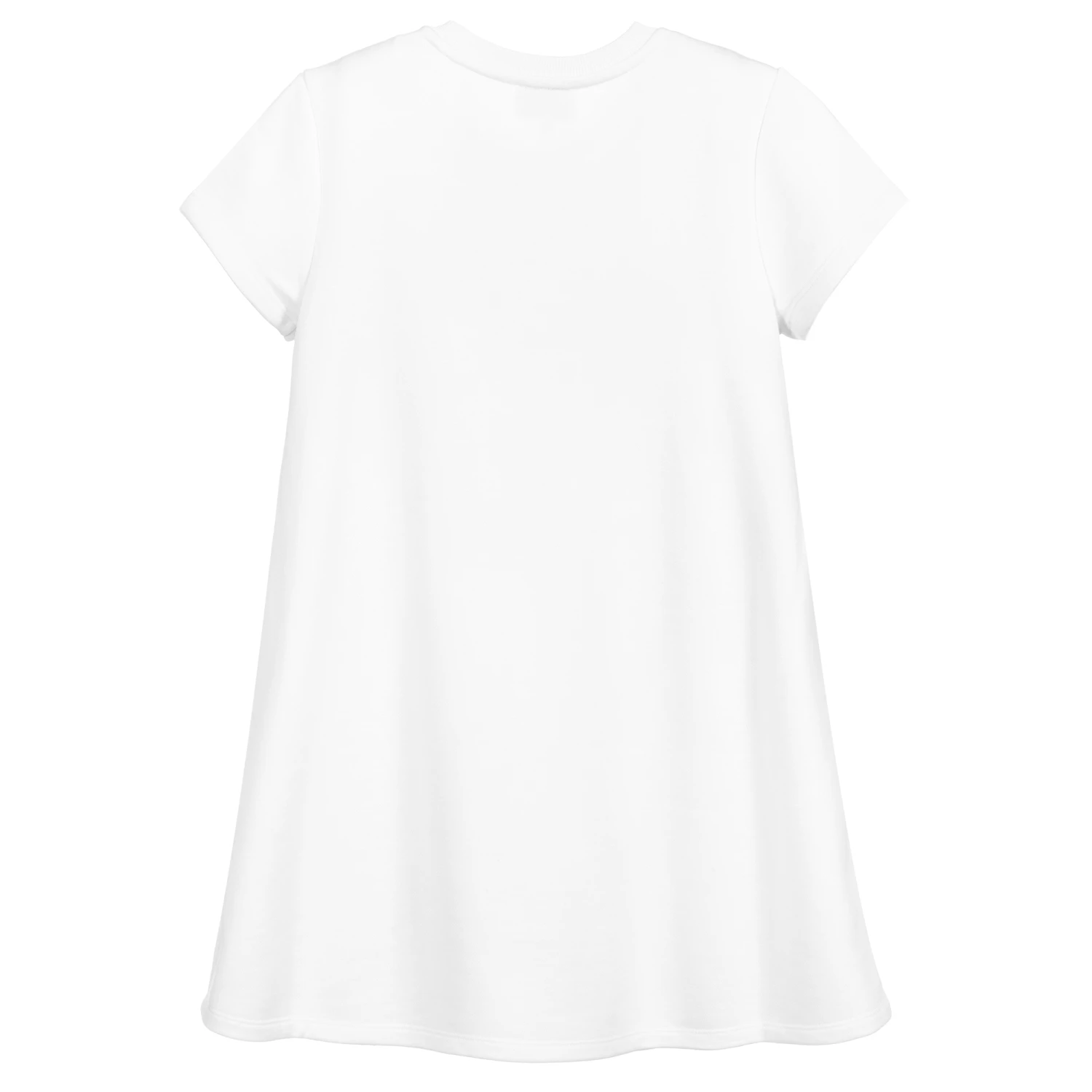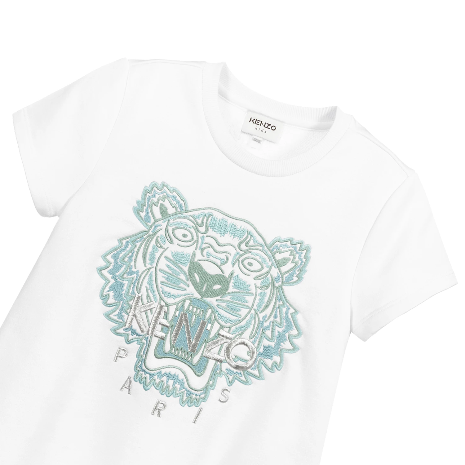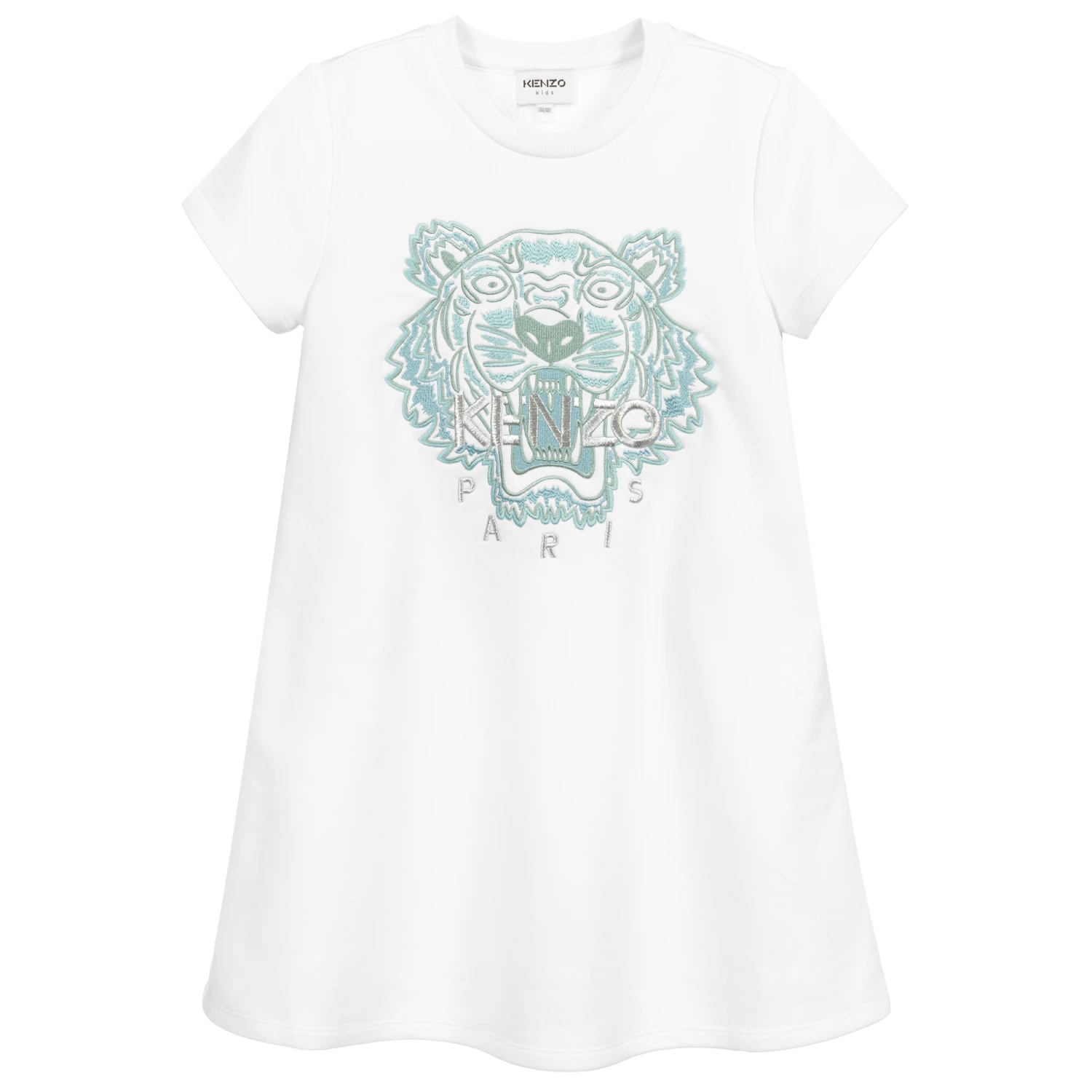 Comfortable and stylish teen girls white jersey dress from KENZO KIDS, with an embroidered Tiger logo in shades of aqua blue and silver. The perfect transitional piece, it is made in a soft cotton and viscose blend, with useful pockets at the sides and a soft lining.