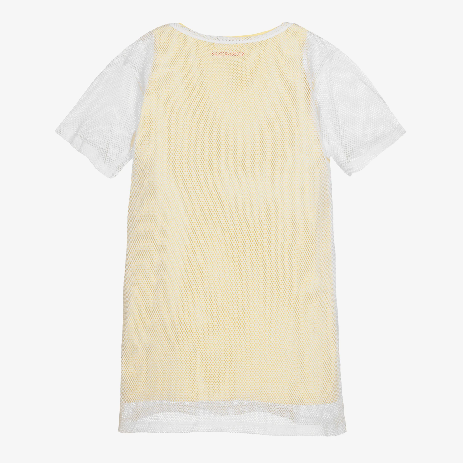 Yellow 2-in-1 dress for teen girls by luxury French designer KENZO KIDS, made in soft, stretchy cotton. Inspired by 90s fashion, the white mesh dress has short sleeves and the brand’s Tiger logo print on the front in black and orange. The yellow sleeveless jersey dress has a pink logo print on the back, and can be worn separately or below the mesh dress.