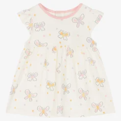 Sweet ivory dress for baby girls by Kissy Love, made in super soft Pima cotton jersey. Patterned with pretty purple and pink butterflies, this cute summer dress has flutter sleeves, a flared skirt and useful poppers on the back. It pairs with matching elasticated knickers to complete the look.