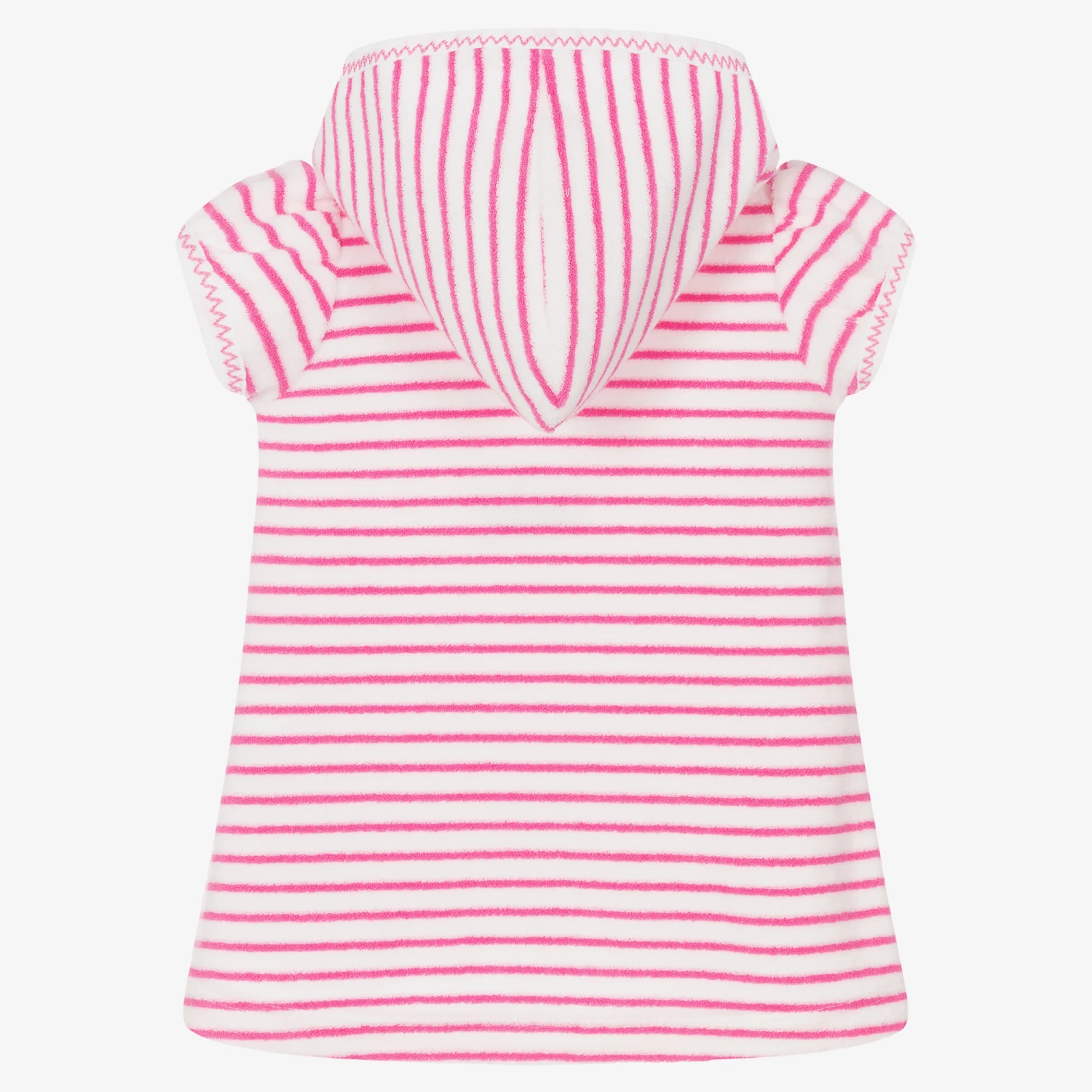 Pink and white striped towelling dress for baby girls by Kissy Kissy, made in super soft Pima cotton terry. Ideal as a beach cover-up, it slips on easily over the head, and has a comfortable jersey lined hood. There is an appliquéd patch on the chest, with pretty sea creature embroidery.