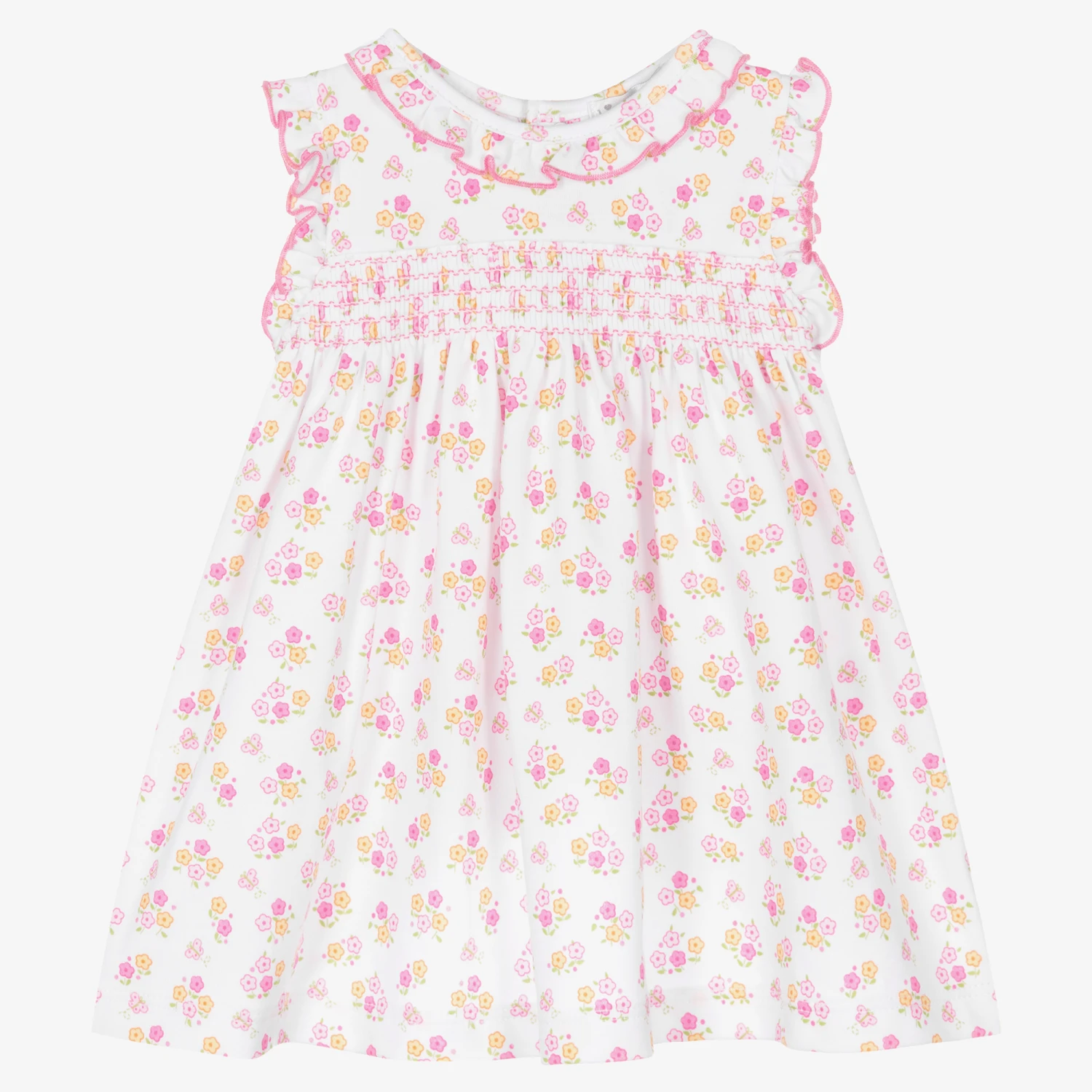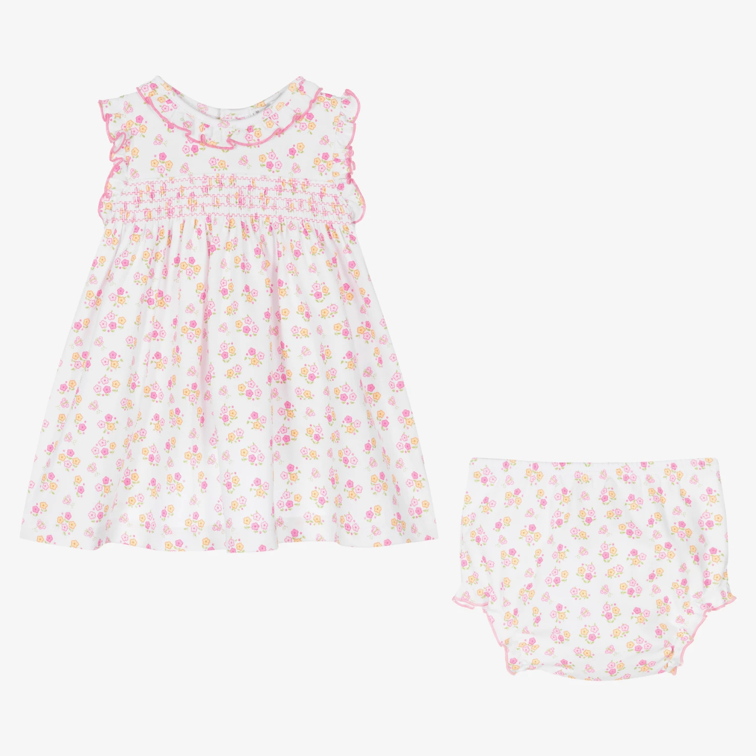 White dress for baby girls by Kissy Kissy, with a pink and yellow floral print and pretty shirring across the bodice. Made in super soft and comfortable Pima cotton jersey, the dress has a frill around the neckline and over the shoulders, trimmed in pink stitching. It fastens with easy-to-use poppers around the back and comes with useful bloomers. The bloomers have an elasticated waist for a comfortable fit on little tummies and frilled, elasticated cuffs.