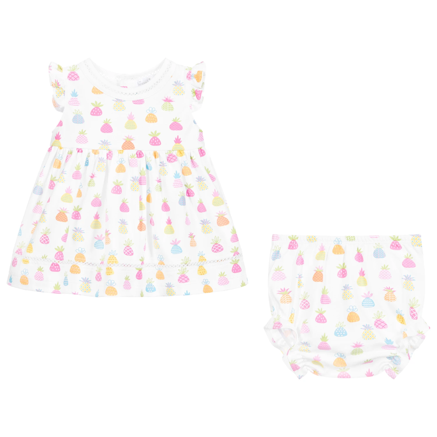 White dress and bloomers set for baby girls by Kissy Kissy, made in super soft and stretchy Pima cotton jersey, with a colourful pineapple print.