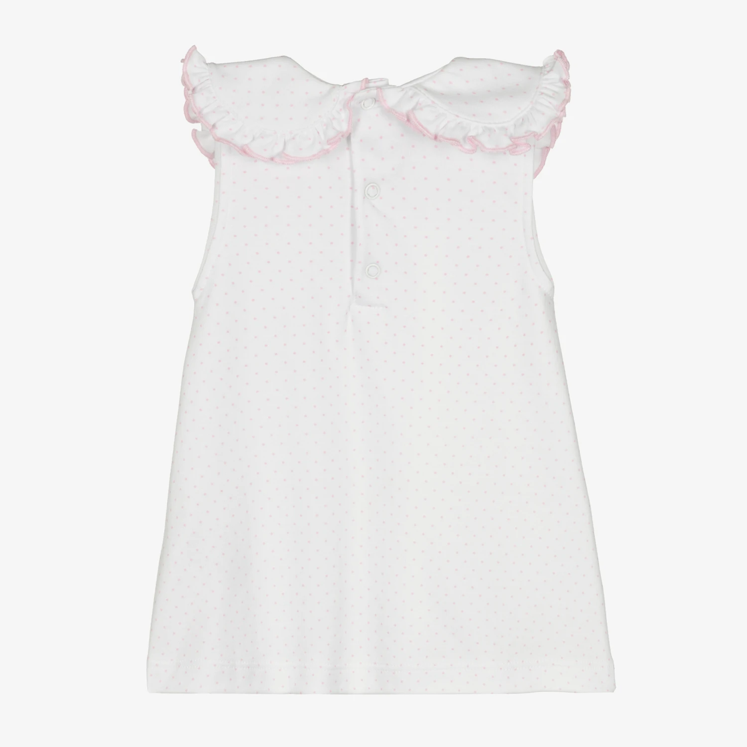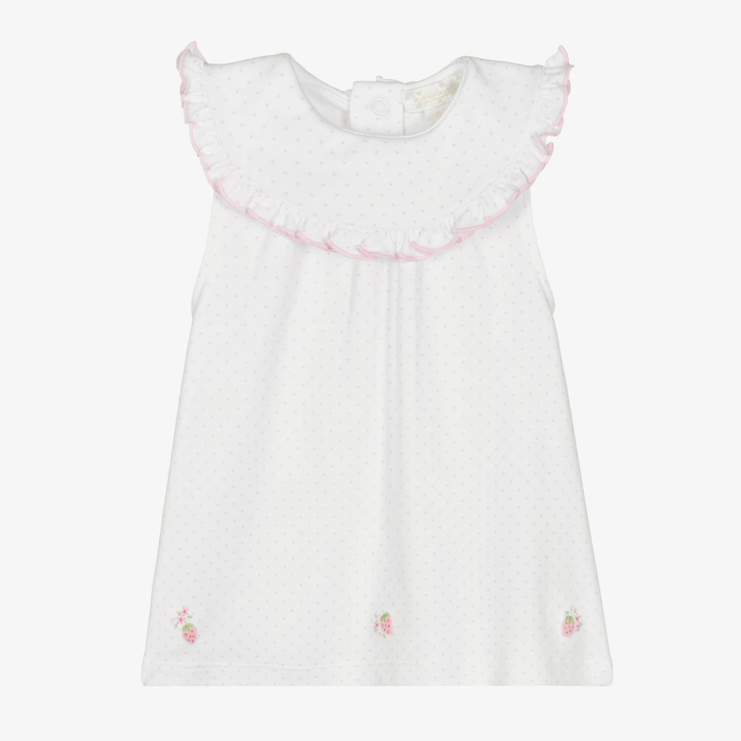 Lovely white dress and knickers for baby girls, by Kissy Kissy. Made in luxuriously soft Pima cotton jersey, both pieces have a sweet pink polka dot print and girly ruffle trims with pink piping. The bib-front dress has intricate hand-embroidered strawberries on the front and useful poppers on the back. Matching elasticated knickers complete this cute, coordinated look.