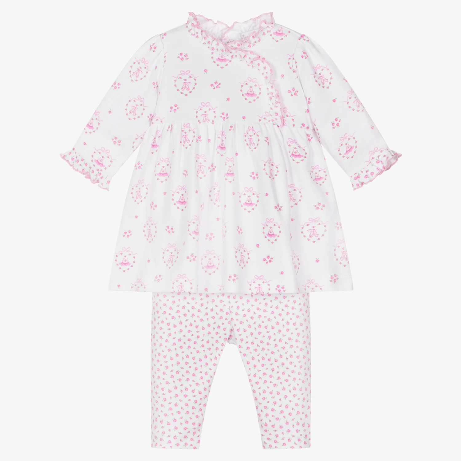 Baby girls white dress and leggings set by Kissy Kissy, made in super soft Pima cotton jersey. Both pieces have a pretty rosebud and ballet print in pink and green. The dress has sweet ruffle trims, with back popper fastenings. The matching leggings have a comfortable elasticated waist.