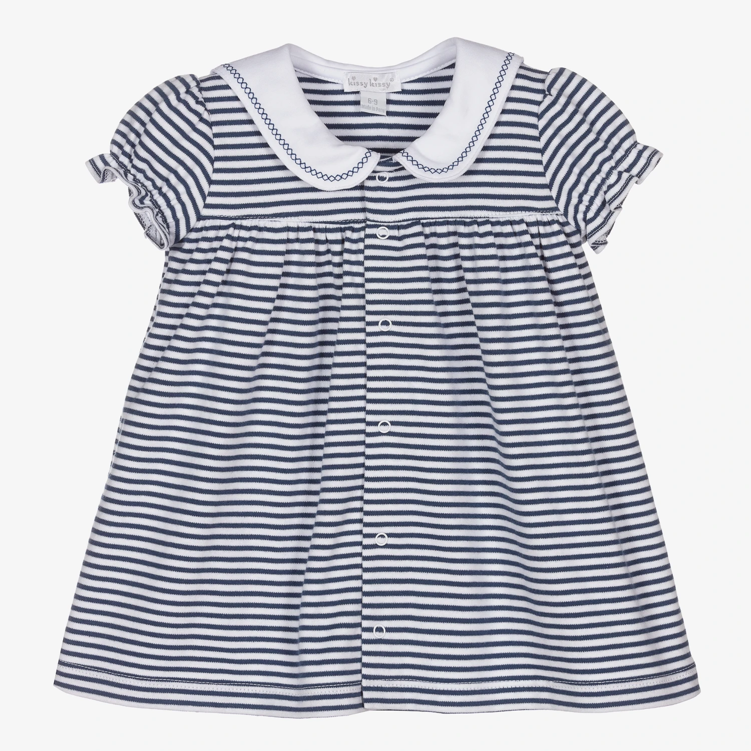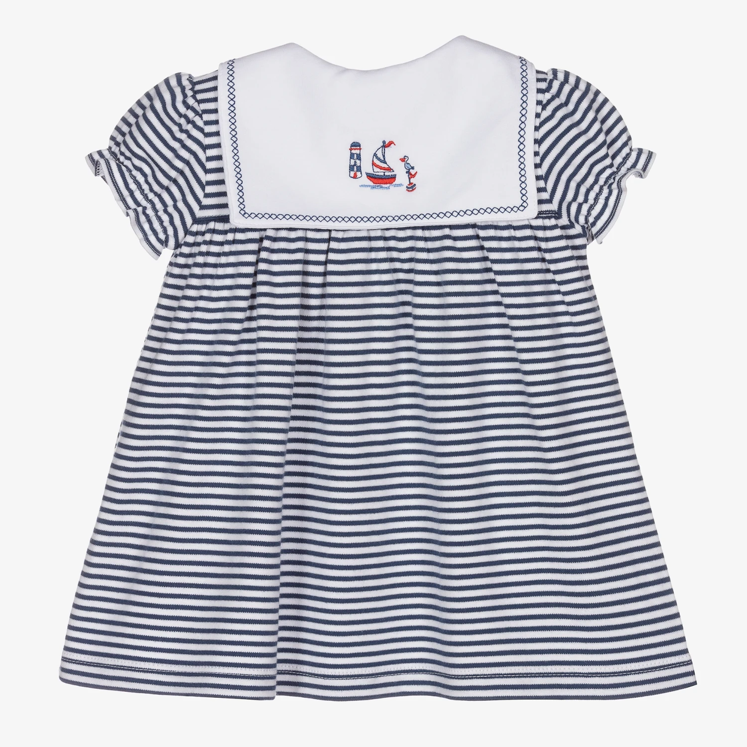Lovely blue and white striped dress and knickers set for baby girls by Kissy Kissy, made in super soft cotton jersey. The nautically themed dress has a white sailor collar on the back with red, white and blue sailing embroidery. Fastening with front poppers, it has an empire waistline and puffed sleeves. It comes with matching knickers.