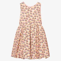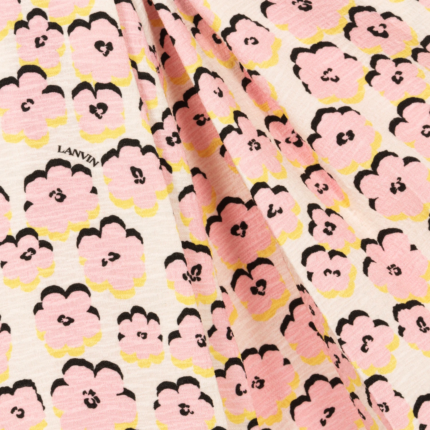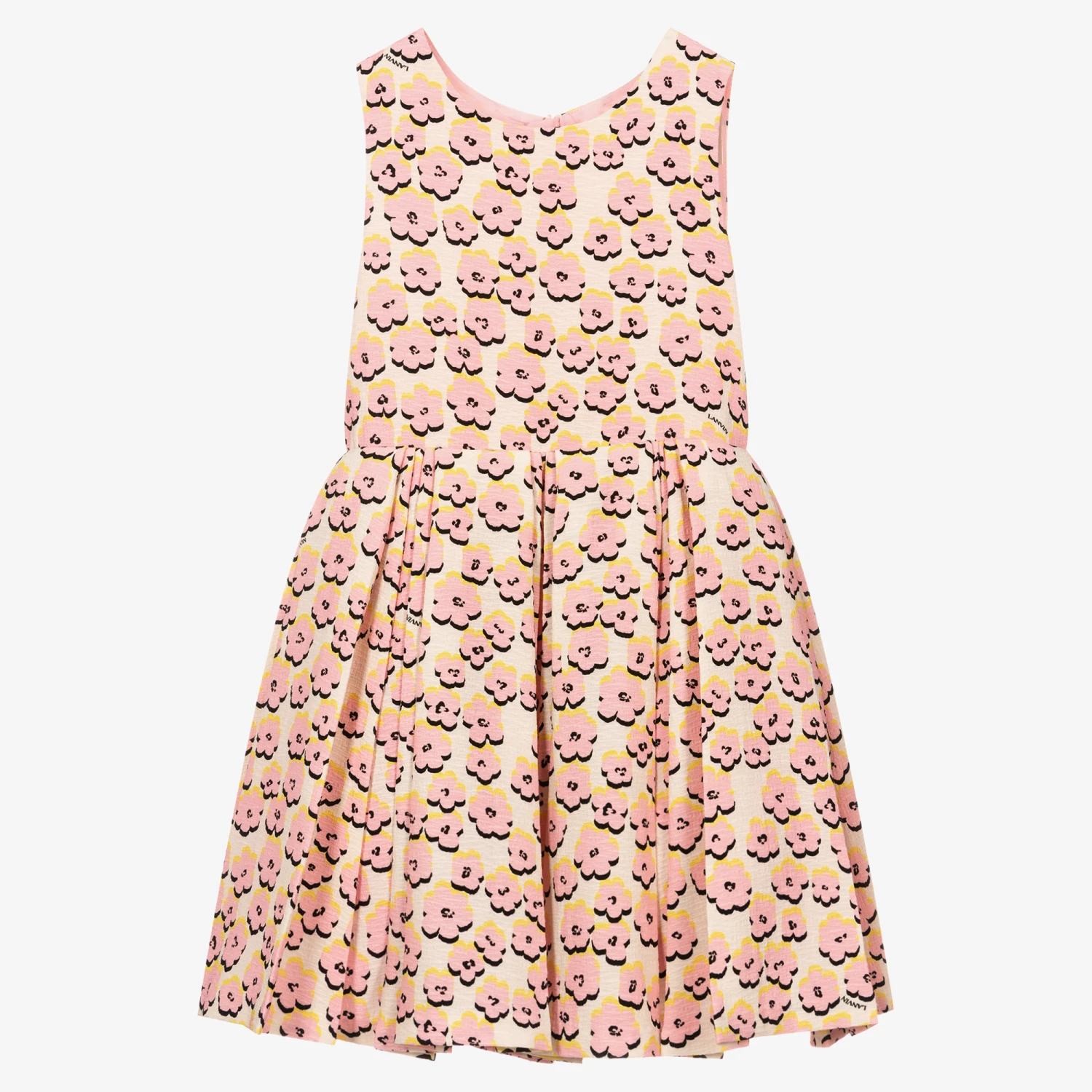 Lovely ivory skater dress for teen girls by luxury French brand Lanvin, made in a lightweight textured material. Inspired by the adult collection, it has a pretty pink, yellow and black daisy pattern, interspersed with black logo prints. The pleated skirt has a lightweight viscose lining and layers of soft tulle for extra volume. This stylish sleeveless dress has a concealed zip fastening on the back.