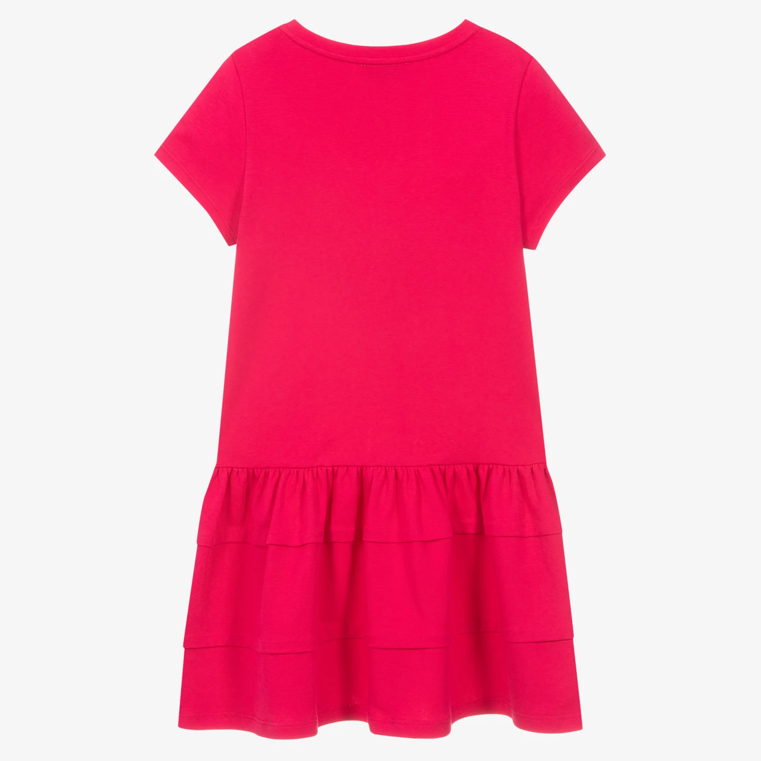 Bright fuchsia pink dress for teen girls by luxury French brand Lanvin, with a shiny silver logo printed on the chest. Simply stylish, it has a dropped waist, with a tiered skirt and is made in soft, comfortable cotton jersey.