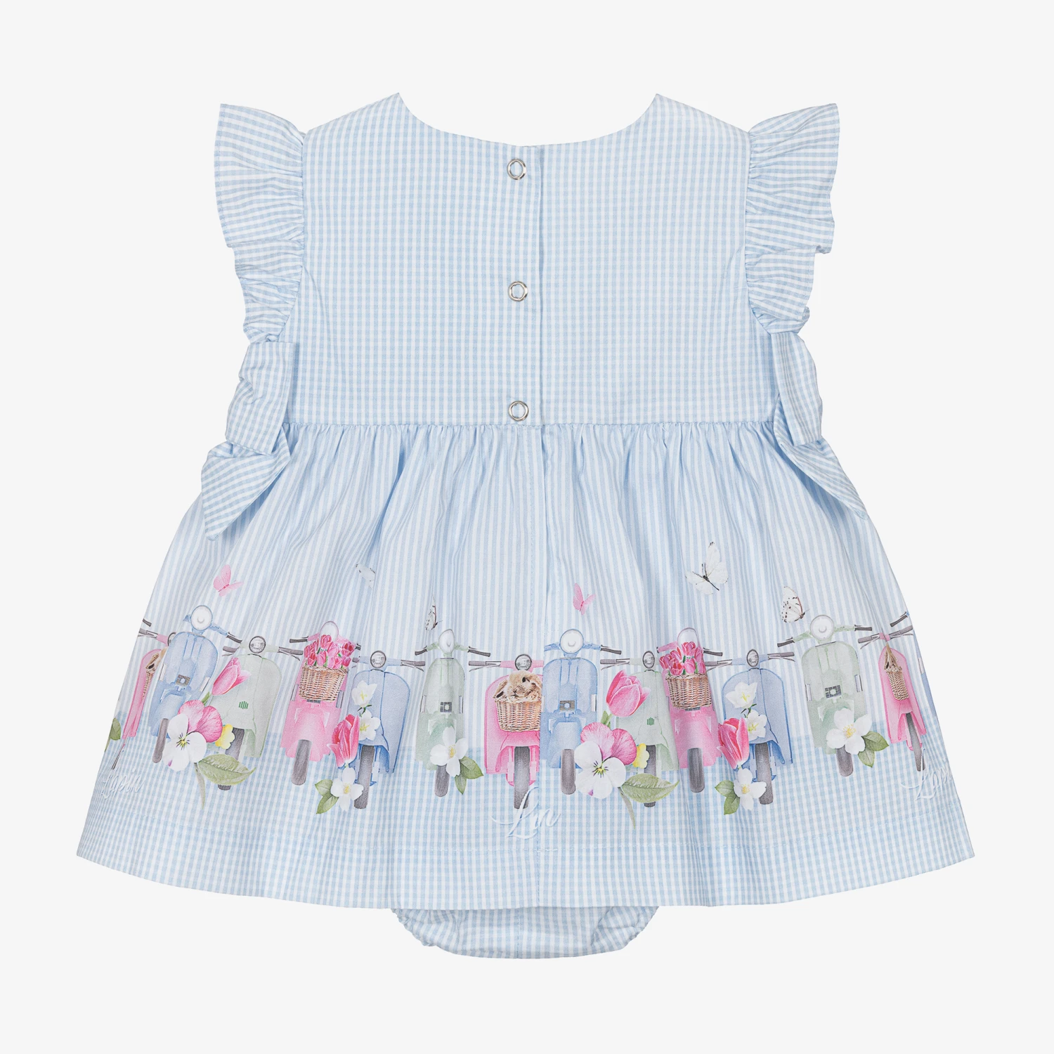 In blue and white stripes and gingham checks, this lovely cotton poplin dress for baby girls is by Lapin House. It has a cute print of colourful scooters, flowers and bunny with subtle logos around the hem. There are ruffles on the shoulders and pretty bows on each side. Easy and practical, the dress comes with attached knickers and fastens with poppers down the back and between the elasticated legs.