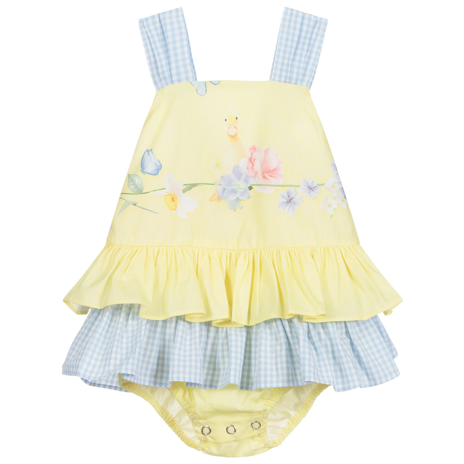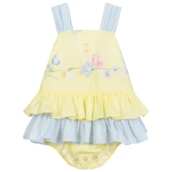 Baby girls poplin dress by Lapin House, with an attached bodysuit. There is a spring time print on the yellow bodice, and the straps and lower ruffle are blue and white gingham. It has a large blue and white gingham bow on the back and fastens with poppers on the back and between the legs.
