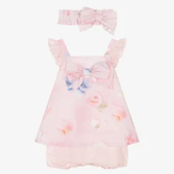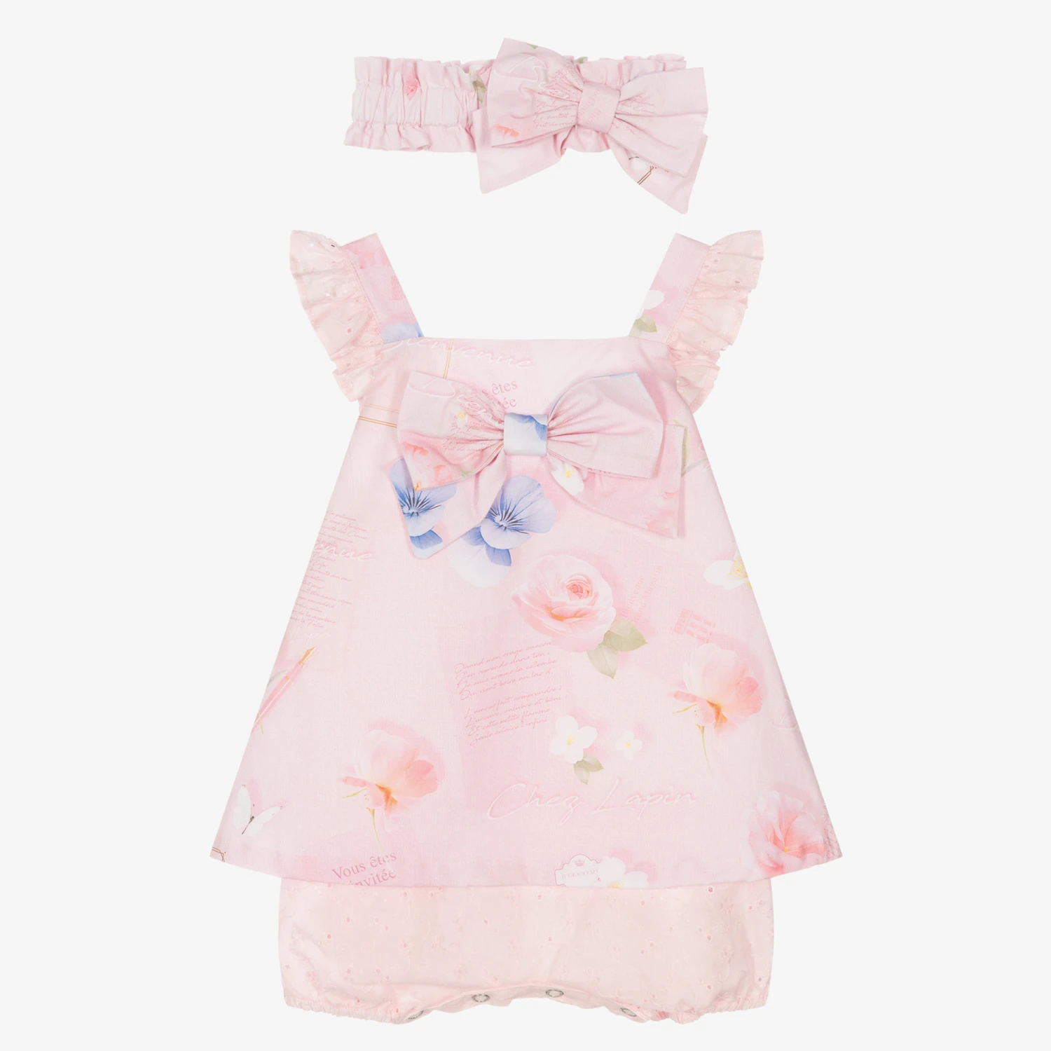 Pretty dress and headband set for baby girls by Lapin House, made in soft cotton with a slight stretch. Both pieces have a colourful floral, butterfly and script print. The dress has attached broderie anglaise knickers with popper fastenings between the legs, and matching ruffle capped sleeves. It has popper fastenings on the back and a large fixed bow on the front. The headband has a matching bow on the front and is elasticated for comfort and a good fit.