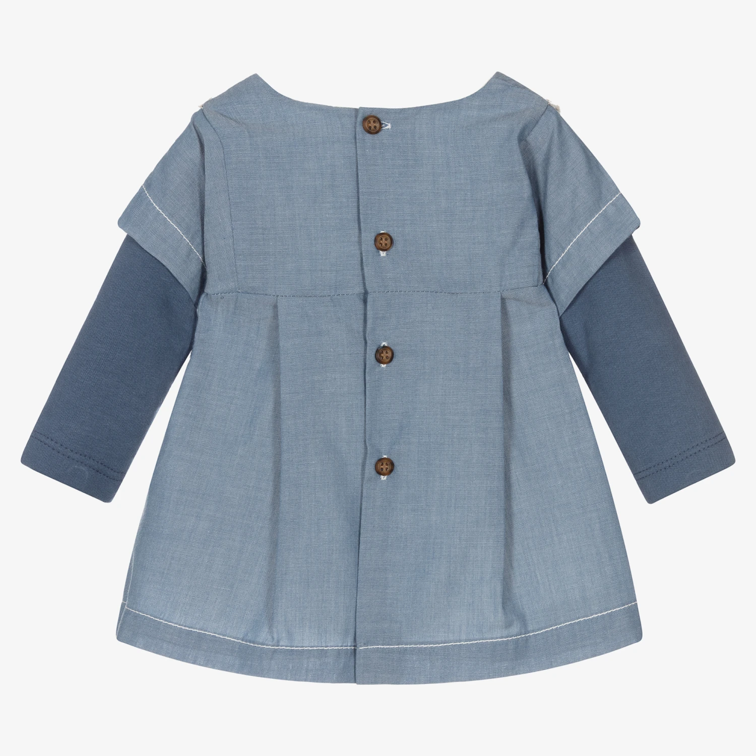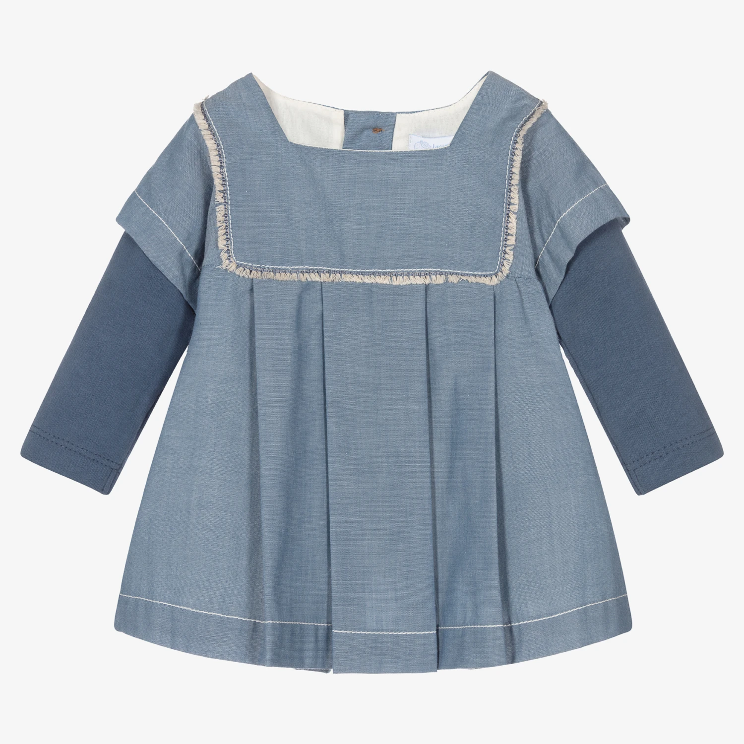 Sweet blue dress for baby girls by Laranjinha, made in lightweight cotton chambray. Fully lined, it has soft jersey sleeves, ivory fringing on the bodice, and a pleated skirt.