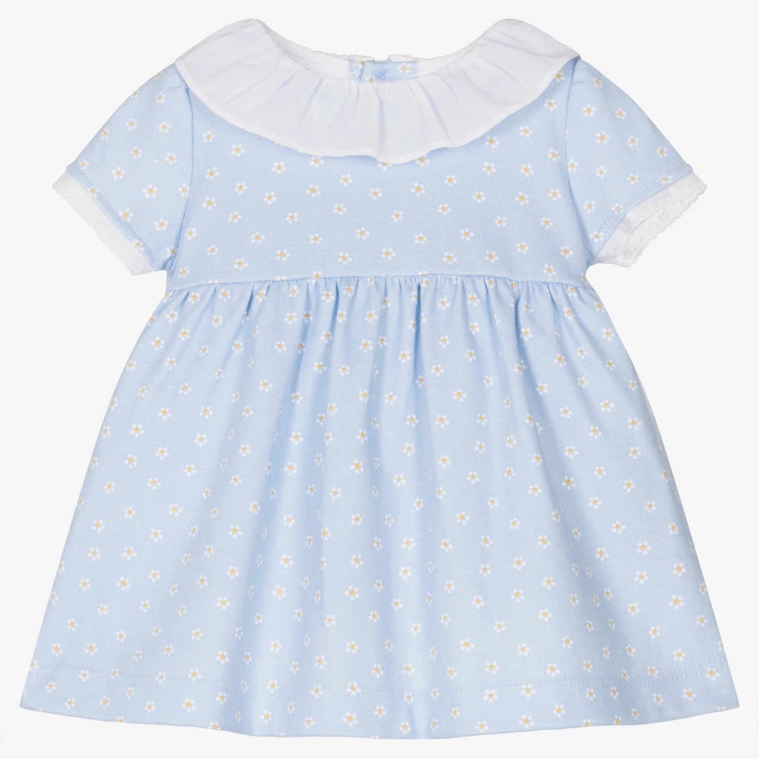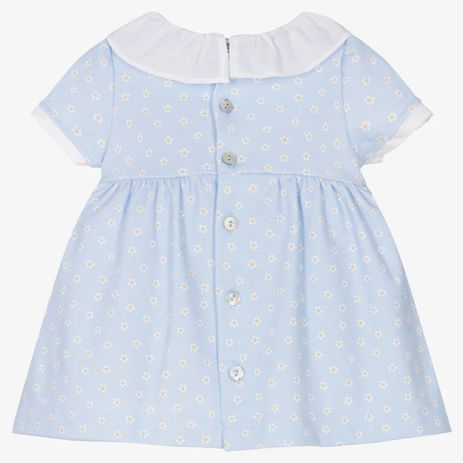 Pale blue dress for baby girls from Laranjinha, made in soft and stretchy cotton jersey. It has an all-over daisy print, a frilled white collar, and embroidered voile trimmed sleeves for a pretty finish. There are branded iridescent button fastenings on the back to make dressing easier.