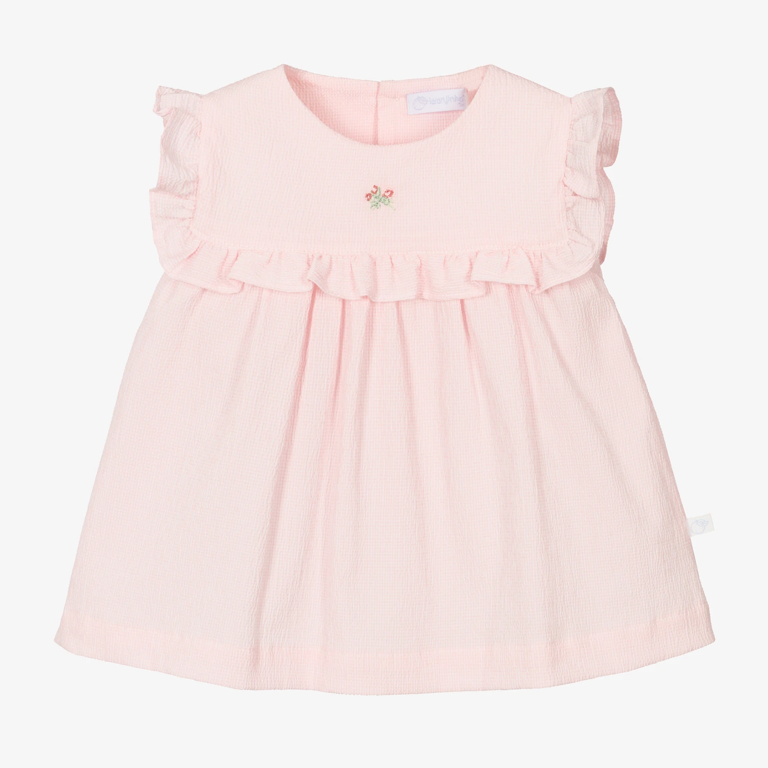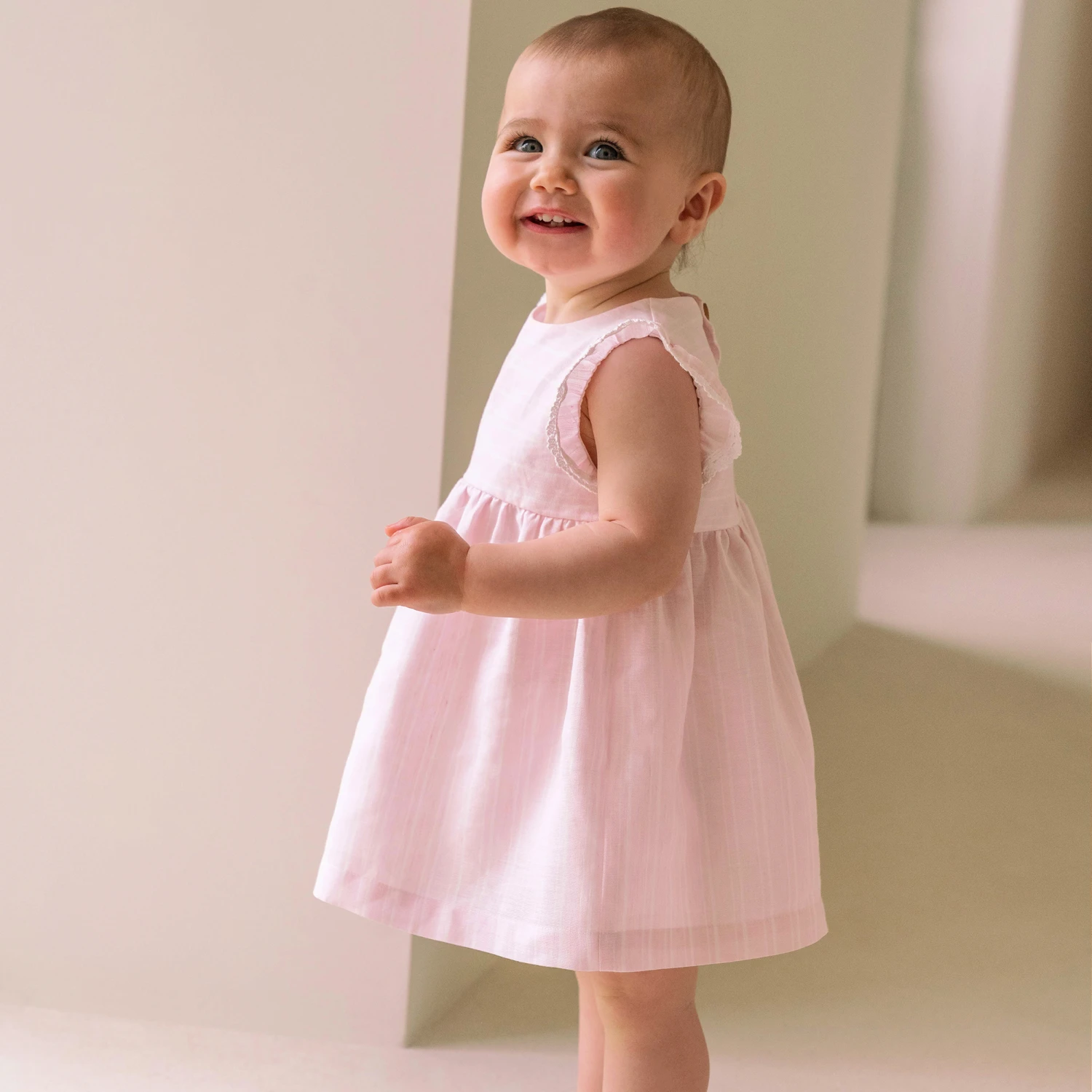 Lovely pink dress for baby girls from Portuguese brand Laranjinha, made in lightweight cotton seersucker. With iridescent button fastenings on the back for easier dressing, this sweet little dress has a small floral embroidery on the chest.