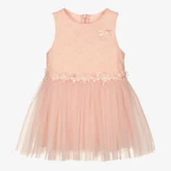 Sweet blush pink dress for baby girls from Le Chic. It is made in soft tulle with full jersey lining for comfort. The bodice has a lovely floral pattern embroidery all over. The skirt is gathered for a fuller look and has a pretty flower embroidery trim on the waist.
