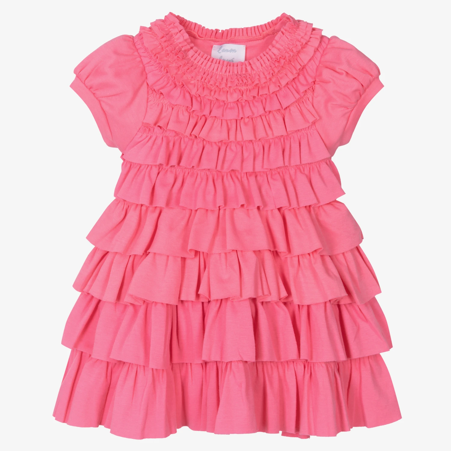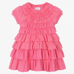 Super girly and fun, this bright pink dress for baby girls is by Lemon Loves Layette. Made from soft Pima cotton, the front is covered in pretty ruffles with a lovely frilled skirt on the back. There are button fastenings on the neckline for a neat finish.