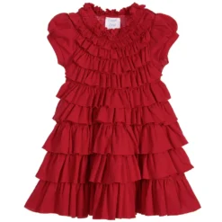 Baby girls red ‘Jane’ dress by Lemon Loves Layette. Made in soft cotton jersey, this sweet design has a tiered ruffle front and neckline, with short, capped sleeves. There is button fastening on one shoulder for easy dressing.