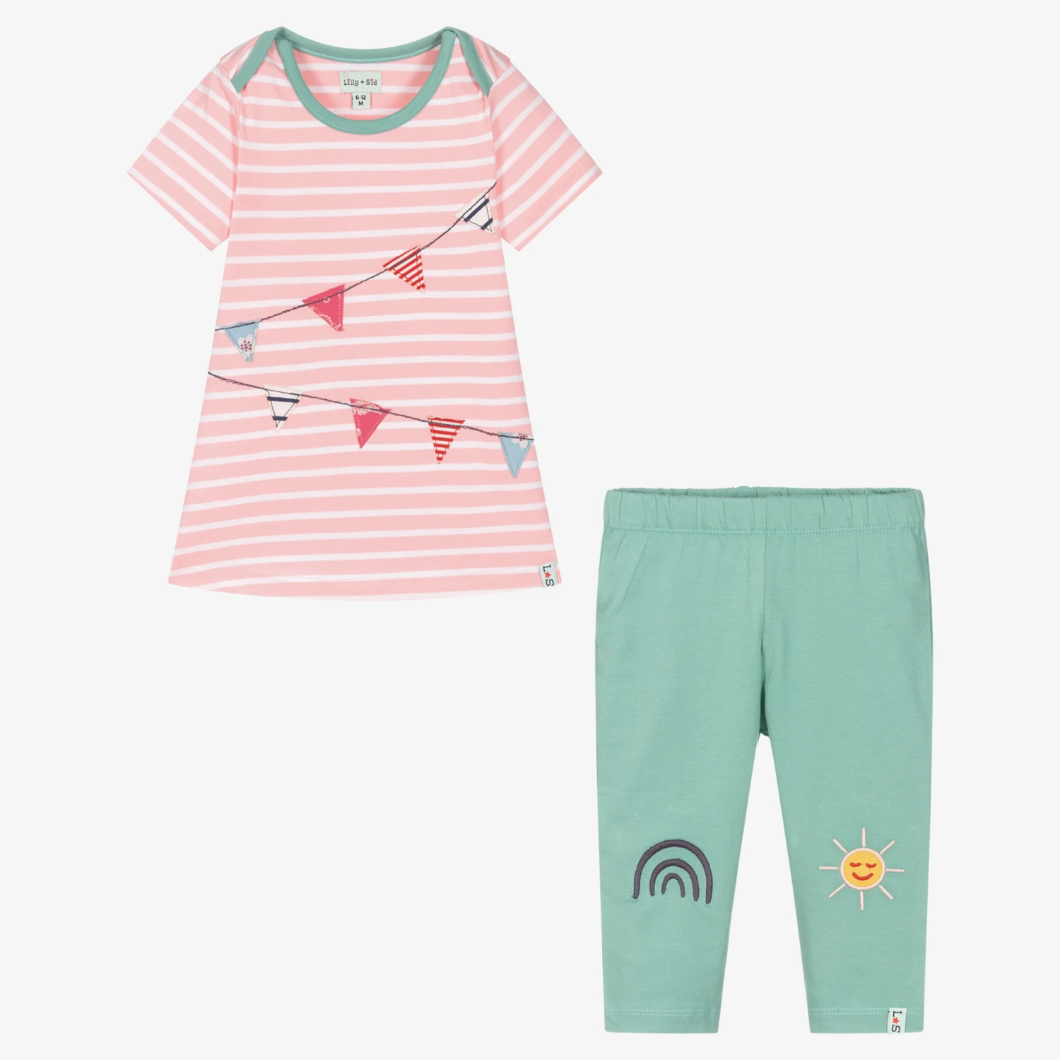 Pink and green, dress and leggings set for baby girls by Lilly and Sid, made in the softest organic cotton jersey. The striped dress has a sweet bunting design stitched on the front, with a folded neckline to help with changing. The leggings have a comfortable elasticated waistband, with a fun rainbow and sun embroidered on each knee.