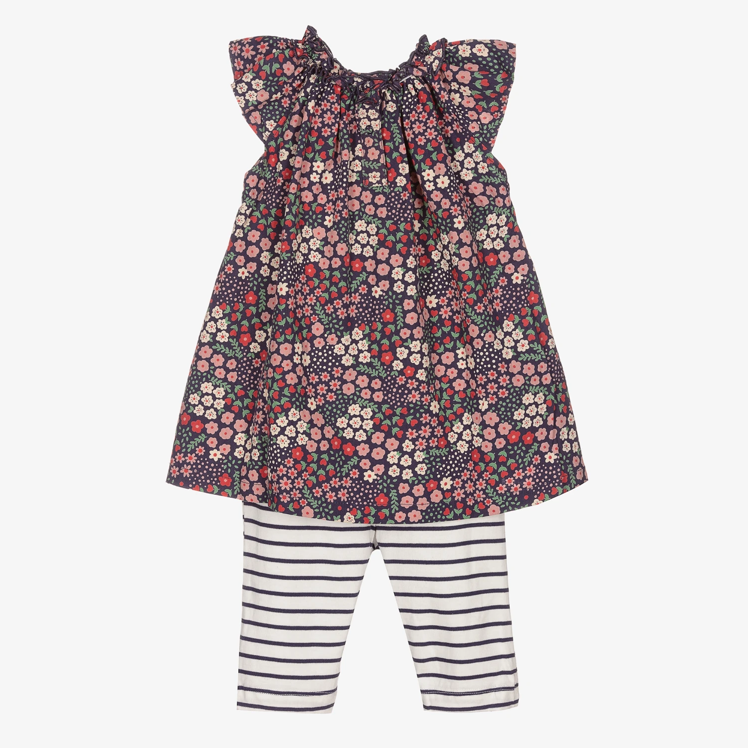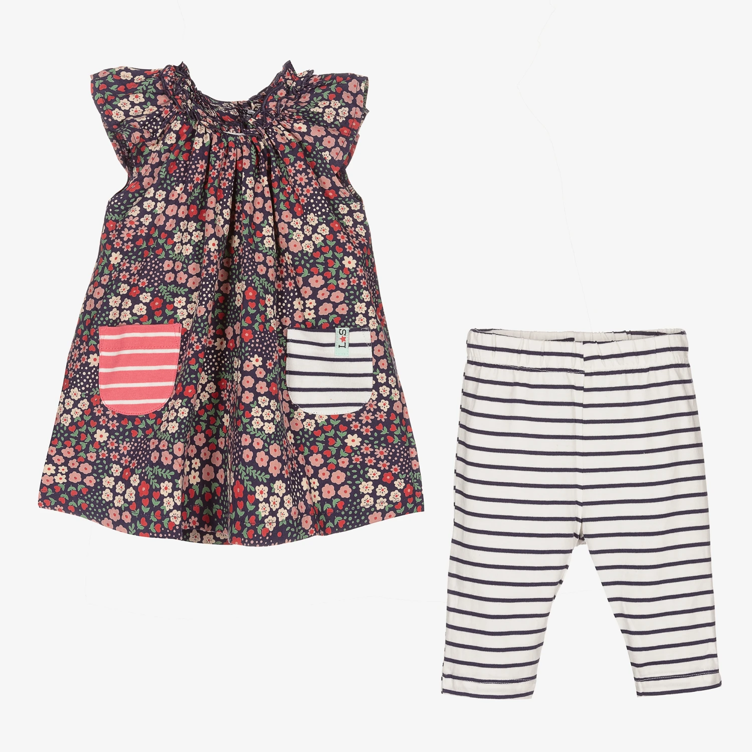 A cute dress and leggings set for baby girls by Lilly + Sid, made in organic cotton. The lightweight dress is navy blue with a pink, red and green ditsy floral print. It falls in gathers from the elasticated neckline, with frills on the shoulders and striped patch pockets. The ivory and navy blue striped leggings have a gently elasticated waistband.