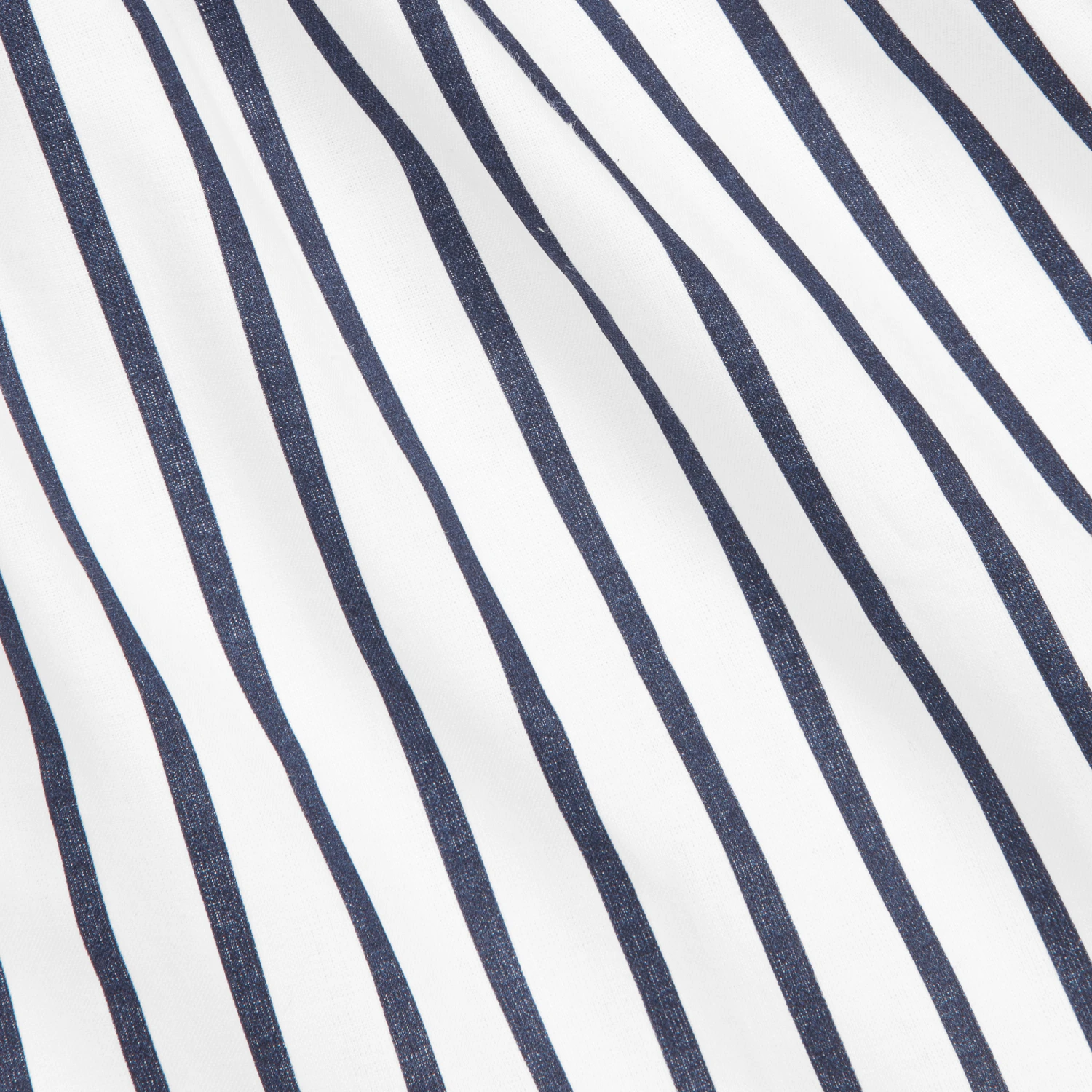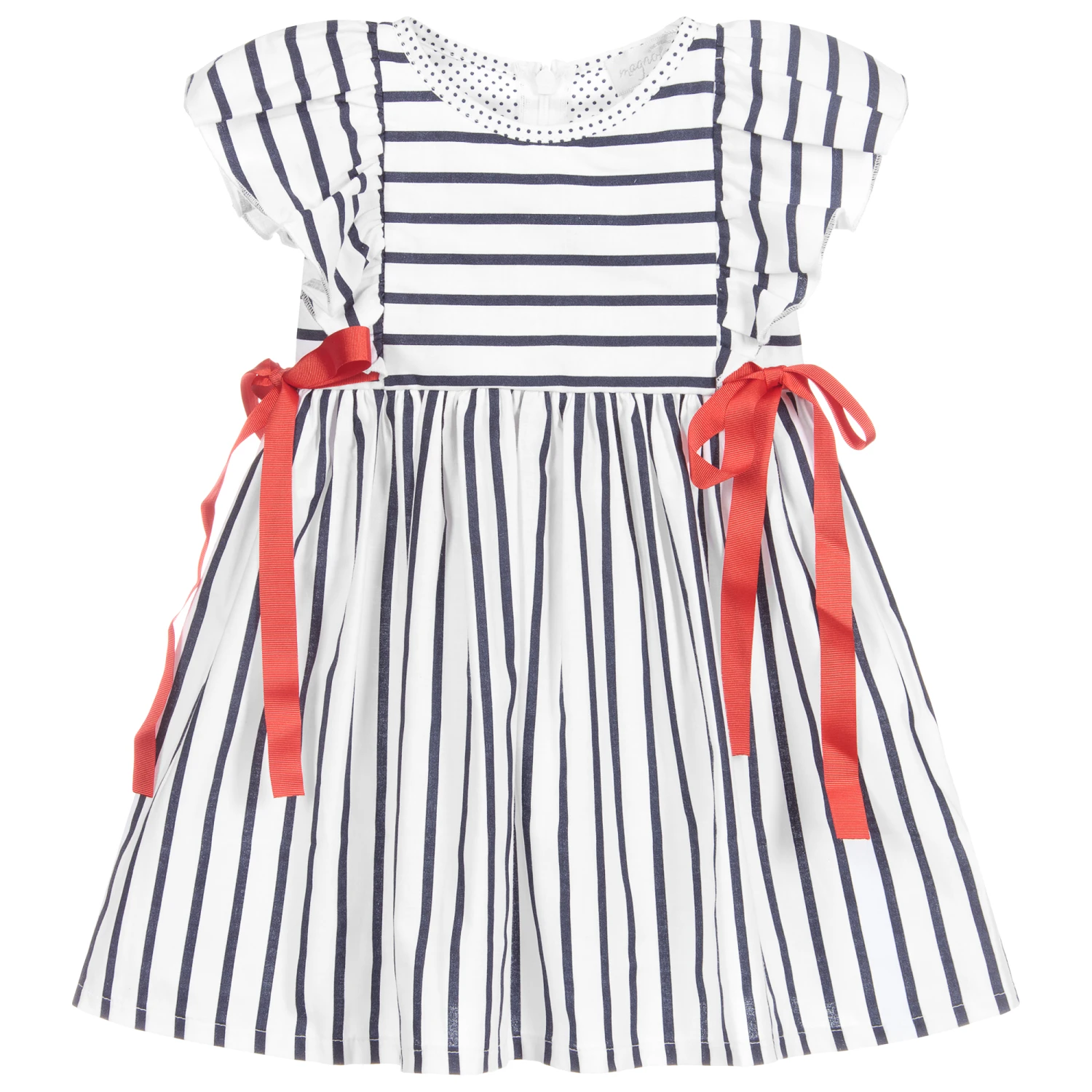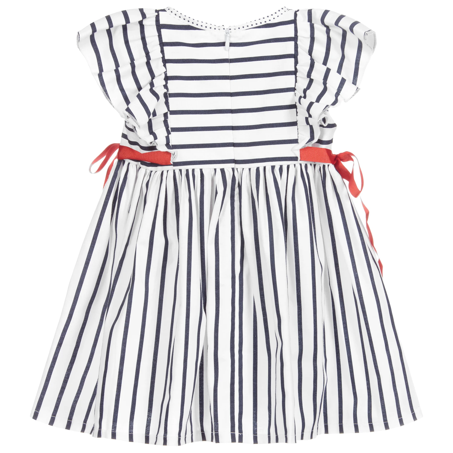 Navy blue and white striped dress for baby girls by Magnolia Baby, made in lightweight cotton. It has ruffles over the shoulders and red grosgrain ribbon ties on the sides.