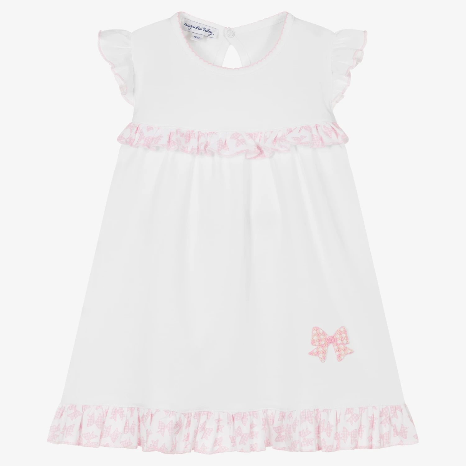 A white jersey dress for baby girls by Magnolia Baby, made in the softest Pima cotton. Lovely and delicate against the skin, this dress has pretty ruffled gingham bow trims, with a terry towelling bow on the hem. It fastens effortlessly with a popper, and comes with matching knickers for a modest style.