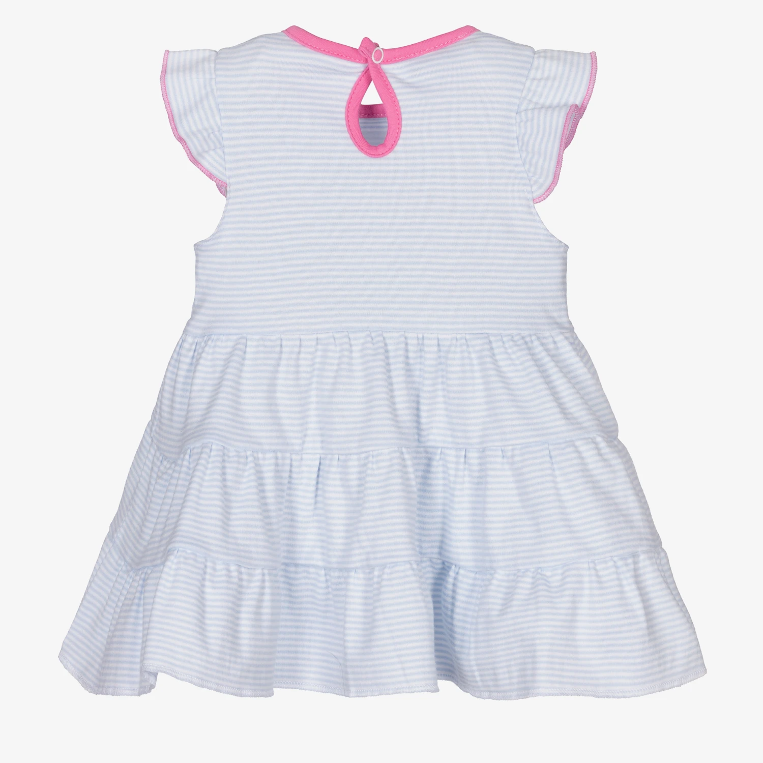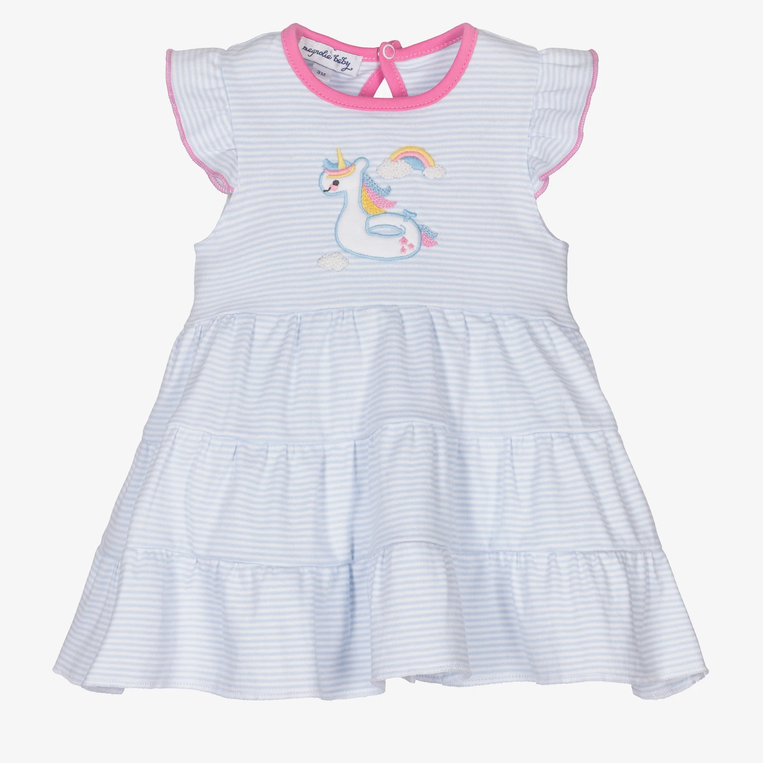Girls blue and white striped dress set from Magnolia Baby, made in soft cotton jersey. The dress has an embroidered unicorn on the chest and pink trims on the ruffle sleeves and neckline. It has a pretty tiered skirt and fastens with a single popper on the back. The set includes a pair of super-soft white cotton jersey knickers.