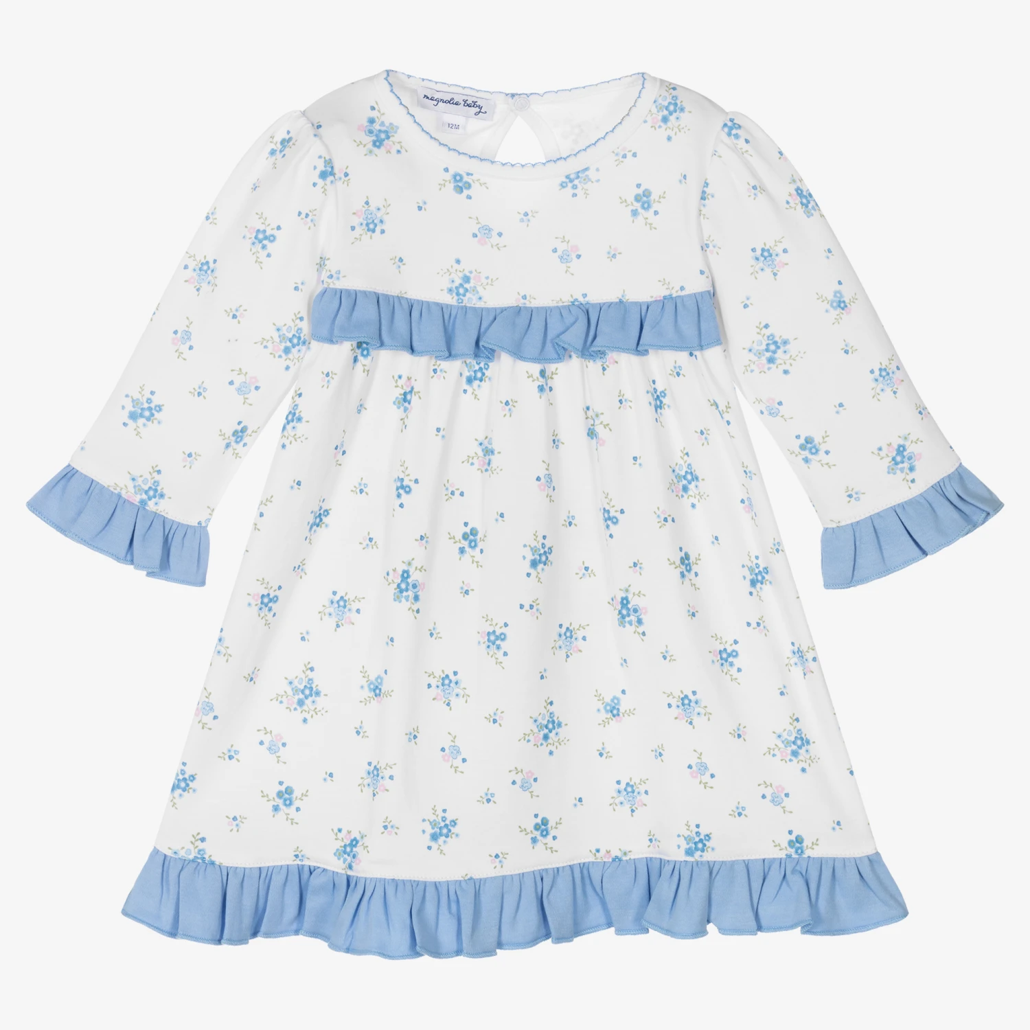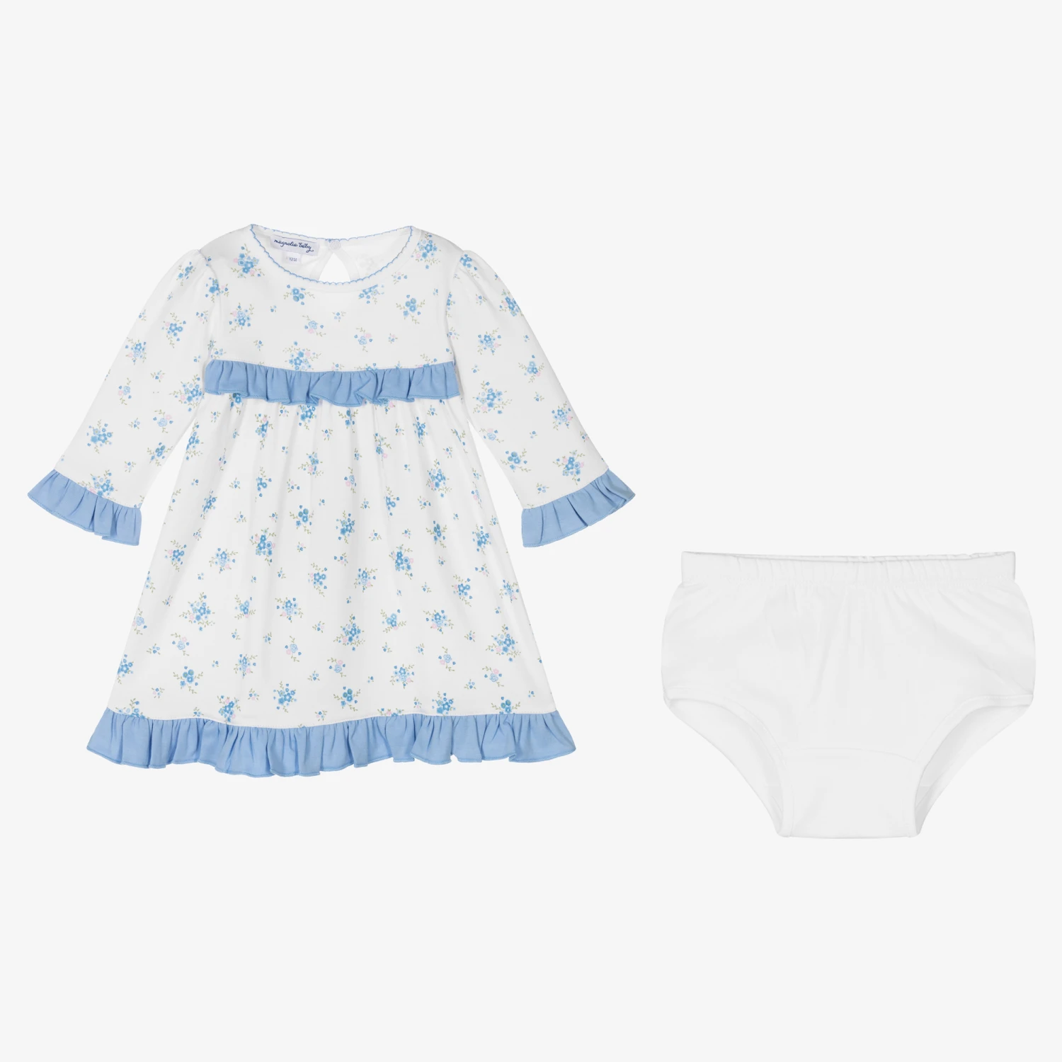 Pretty white dress for girls, by Magnolia Baby. Made in soft Pima cotton jersey, it has a delicate blue floral print all-over and blue ruffle trims. Fastening with a single popper on the back, it comes with plain white elasticated knickers to complete the cute look.