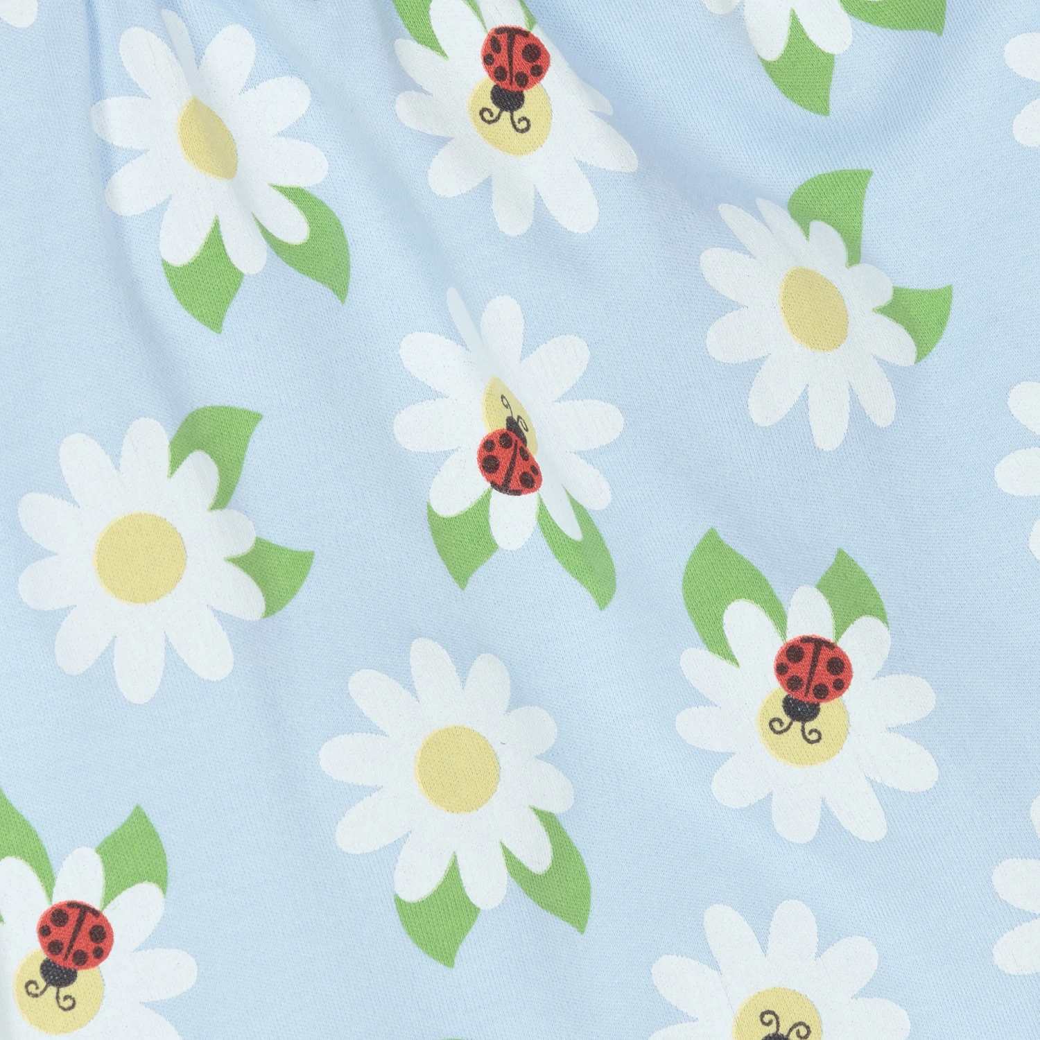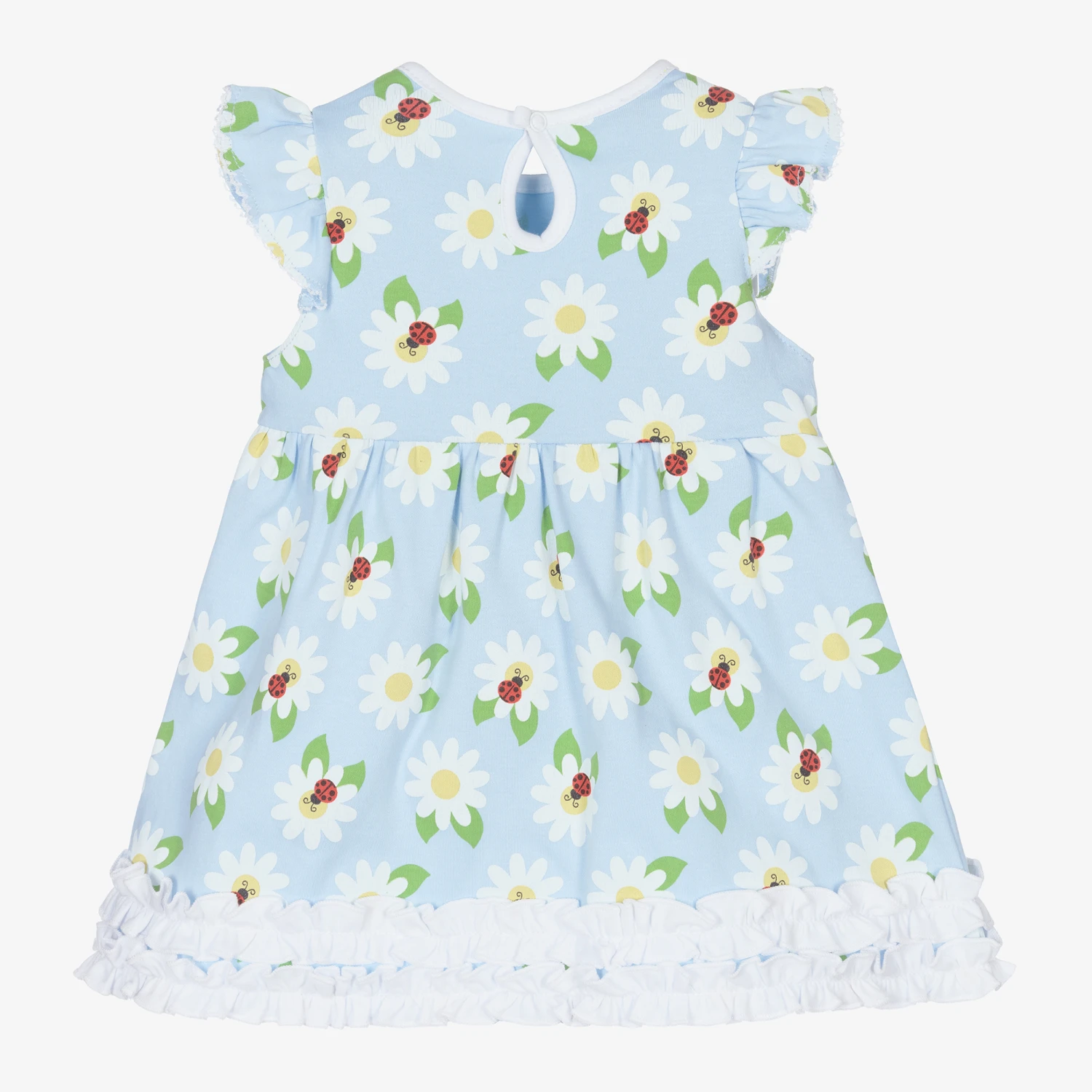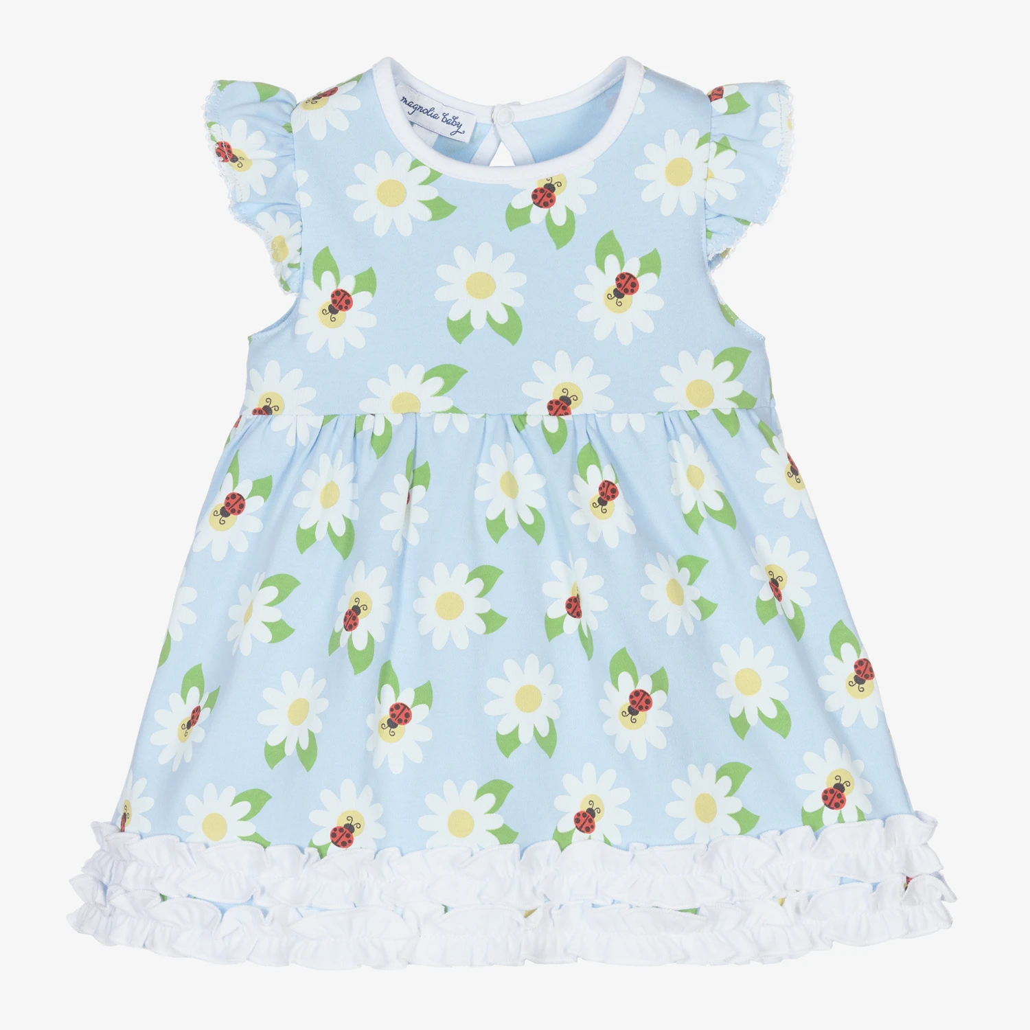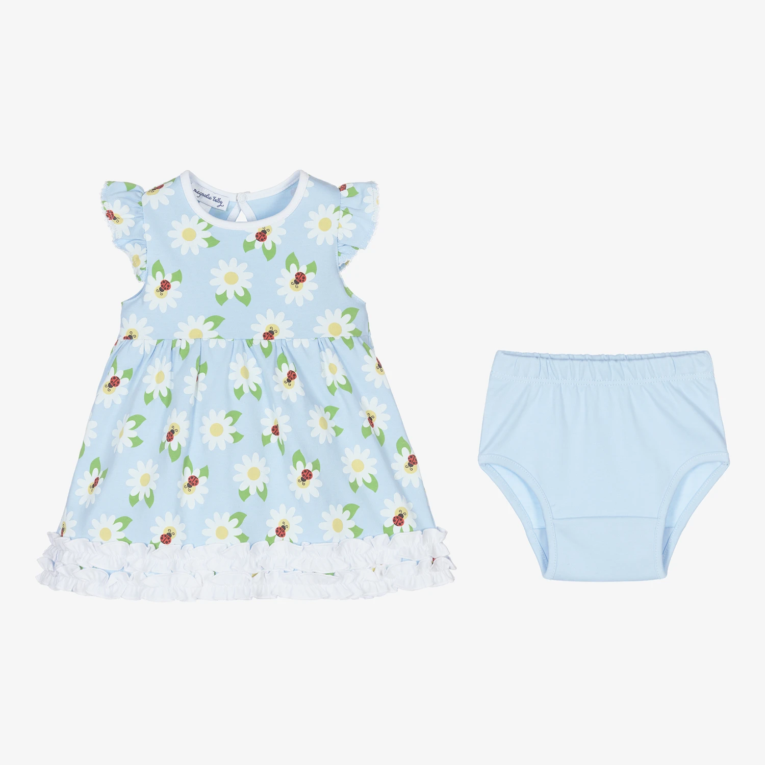 Baby girls blue dress set from Magnolia Baby, made in super-soft Pima cotton jersey with a colourful daisy pattern. There are white frills on the hem and pretty ruffle sleeves. It has a flared skirt and a single popper on the back to fasten. The set includes a pair of super-soft blue Pima cotton jersey knickers.