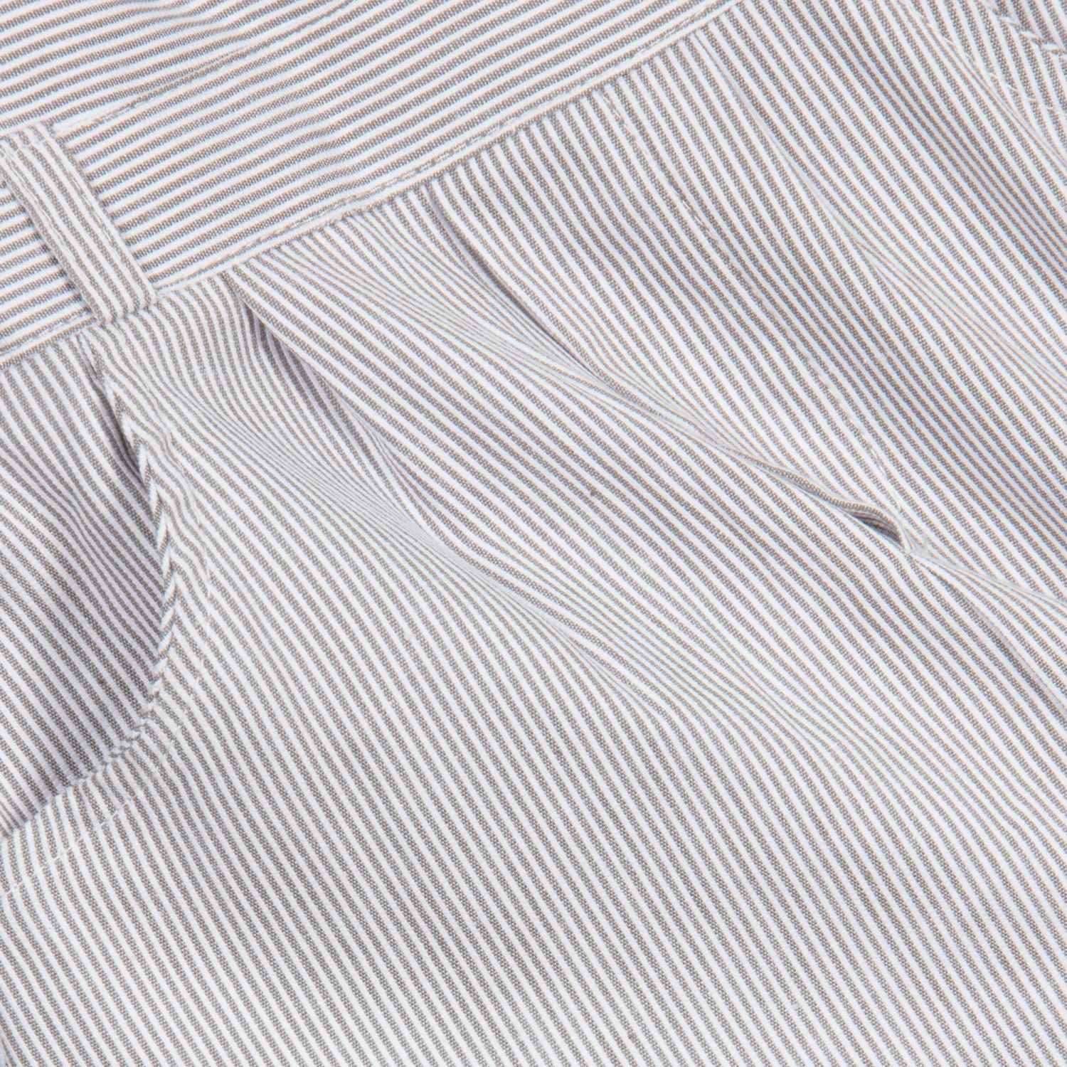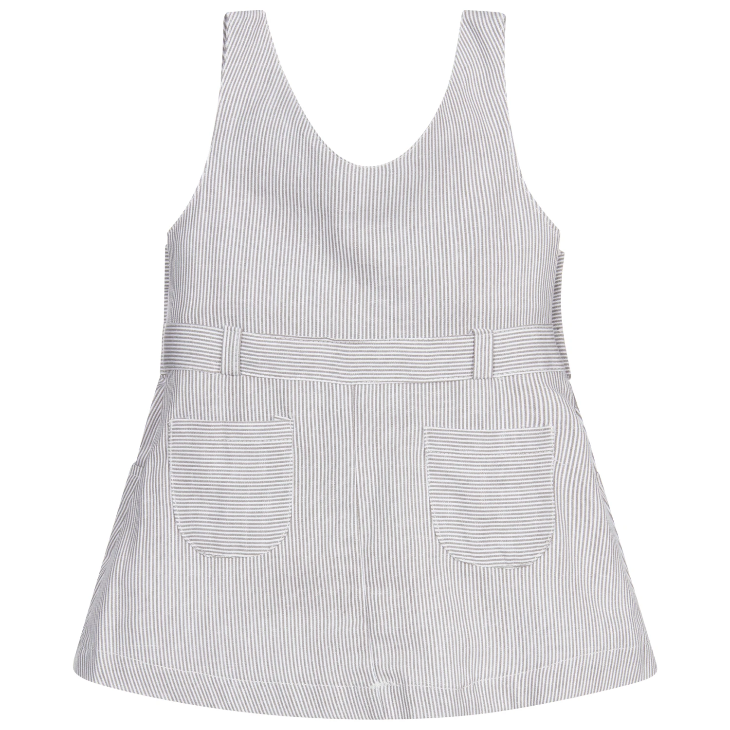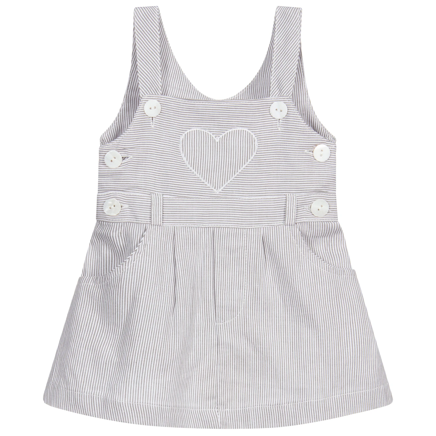 Sweet grey and white striped pinafore dress for baby girls by Malvi & Co. Made in lightweight cotton, it has a heart design on the front. There are pockets on the front and back, belt loops on the waist and button fastenings.