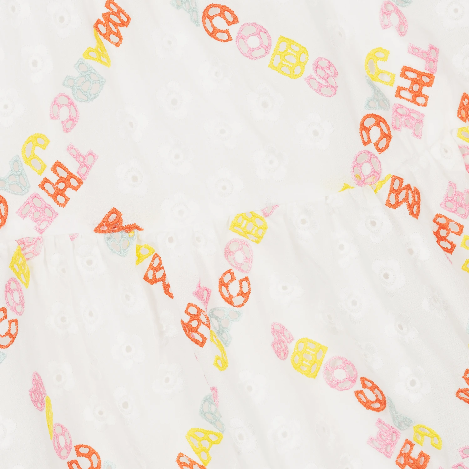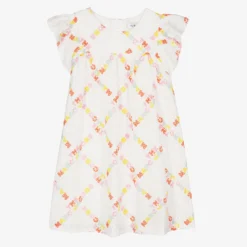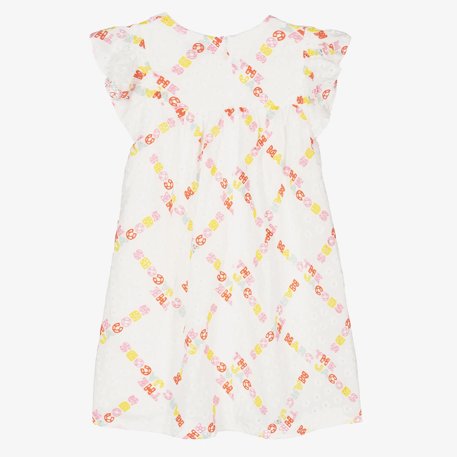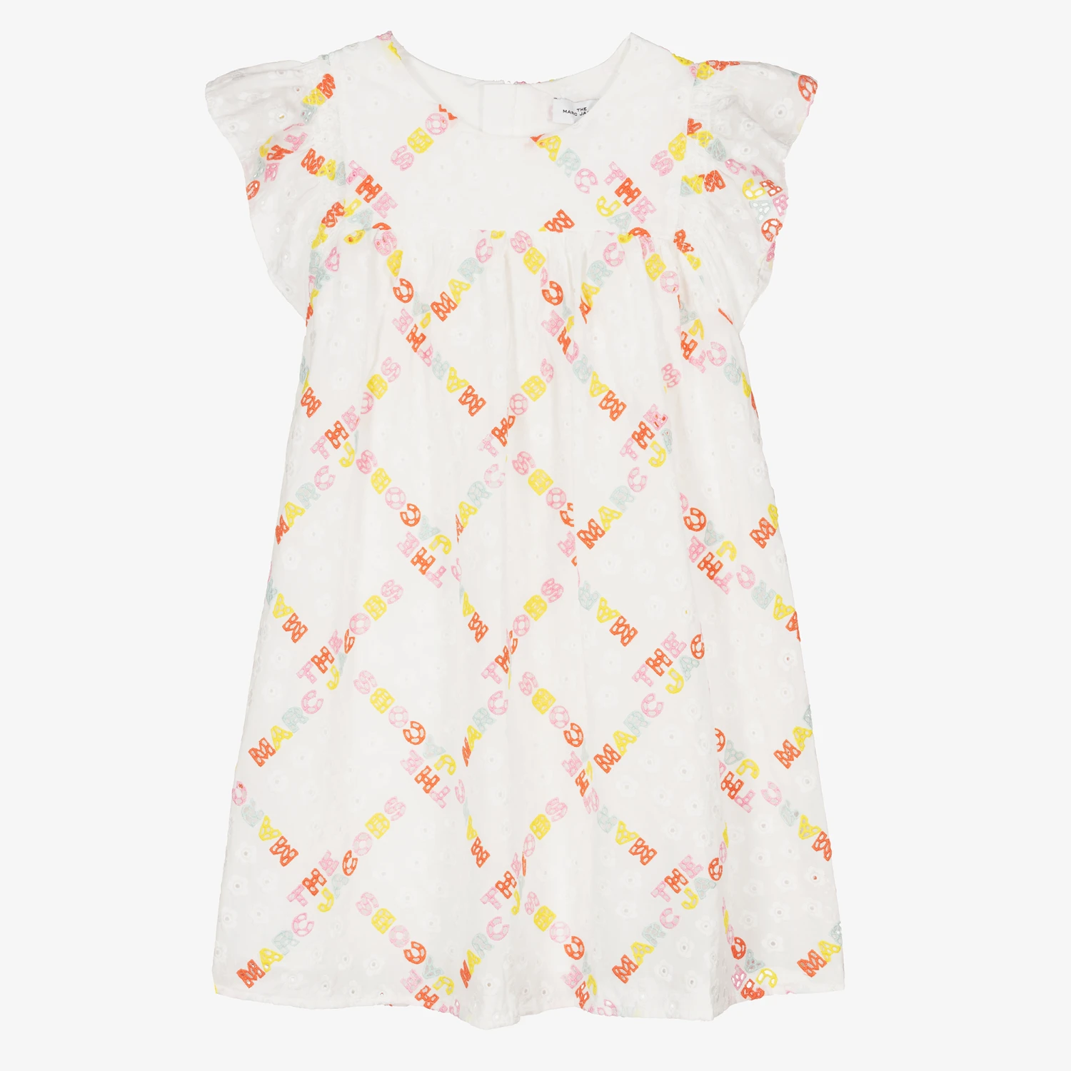 A white dress for teen girls by THE MARC JACOBS, made in soft cotton broderie anglaise. This summer dress has a sweet daisy floral design with a colourful cut-out logo motif within the material. There are ruffled, elasticated sleeves. Fully lined, it has a concealed zip fastening on the back.
