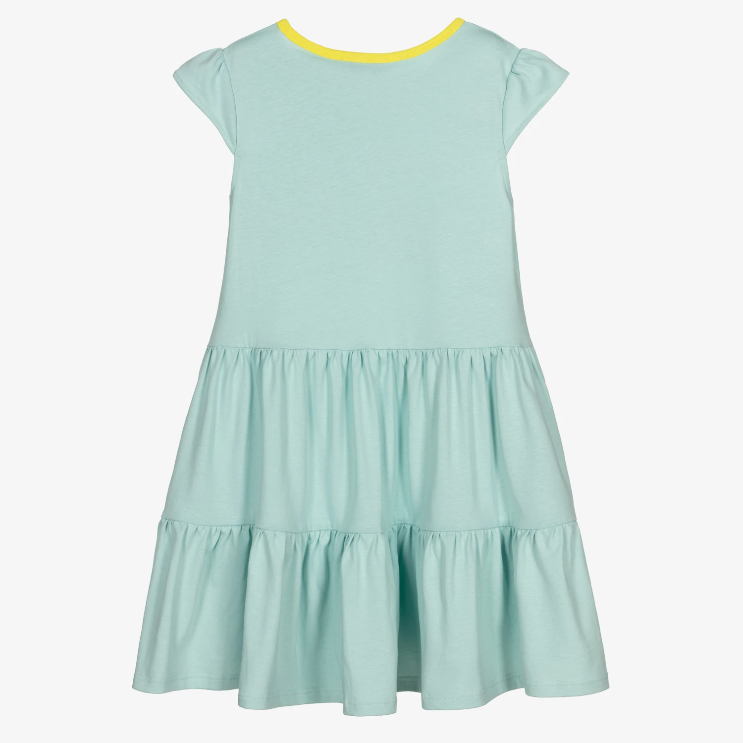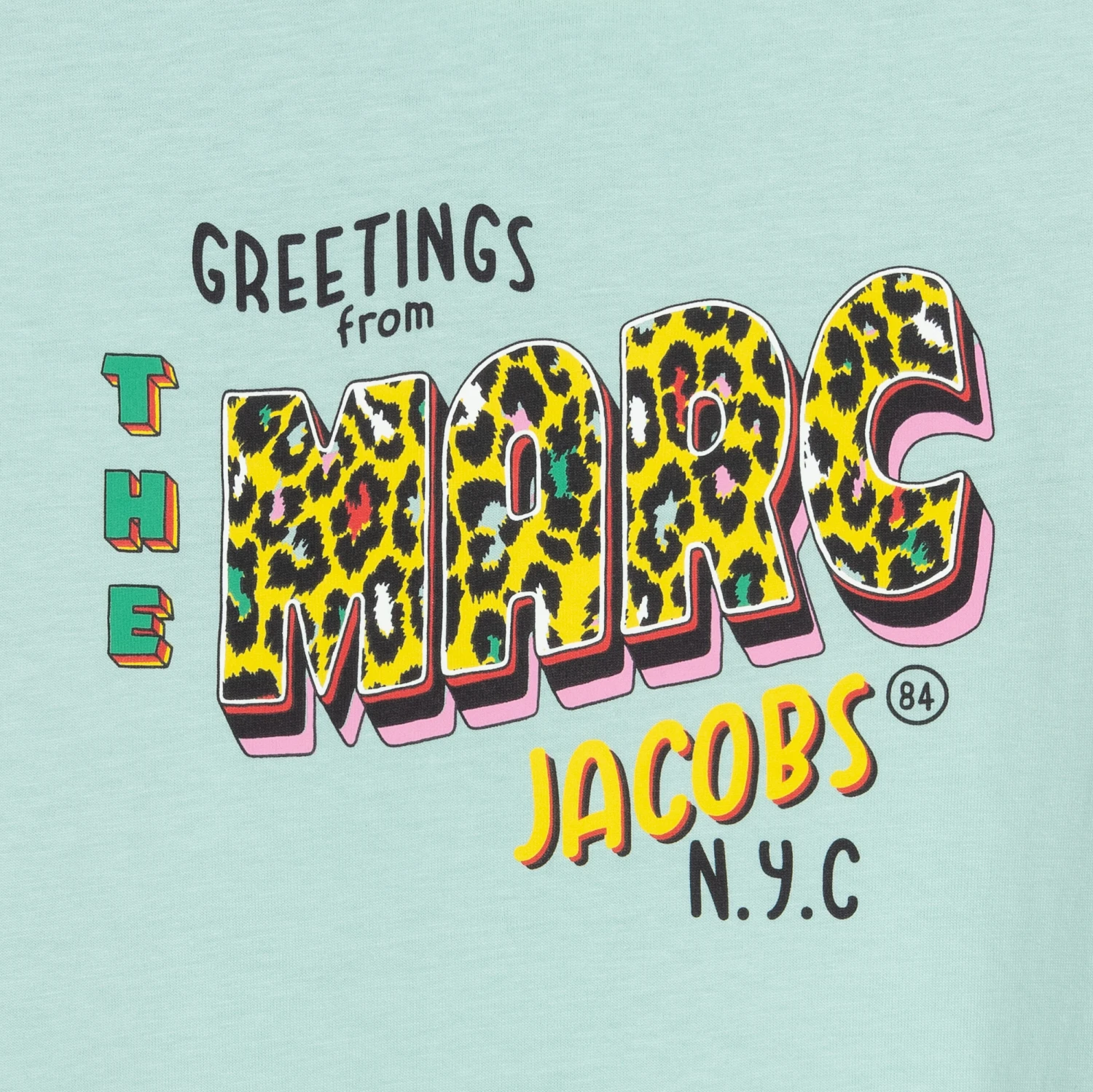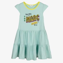Teen girls pale blue dress by THE MARC JACOBS, made in soft and stretchy organic cotton jersey. With a bright yellow neckline, the bodice has a 50s postcard-style print with a ‘Greetings from The Marc Jacobs’ logo in yellow, pink and green and cheetah print accents. The skirt is tiered and there are capped sleeves.