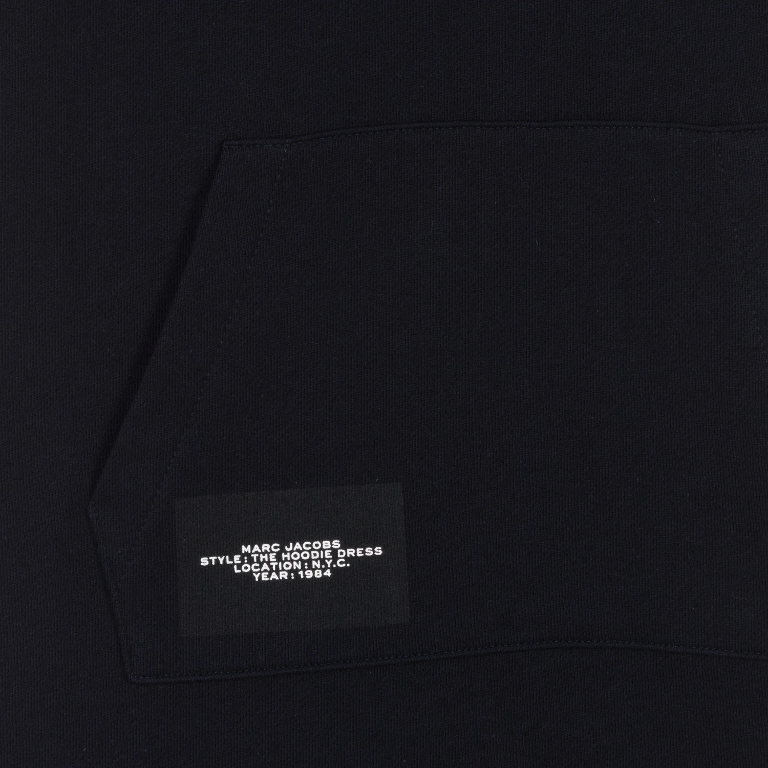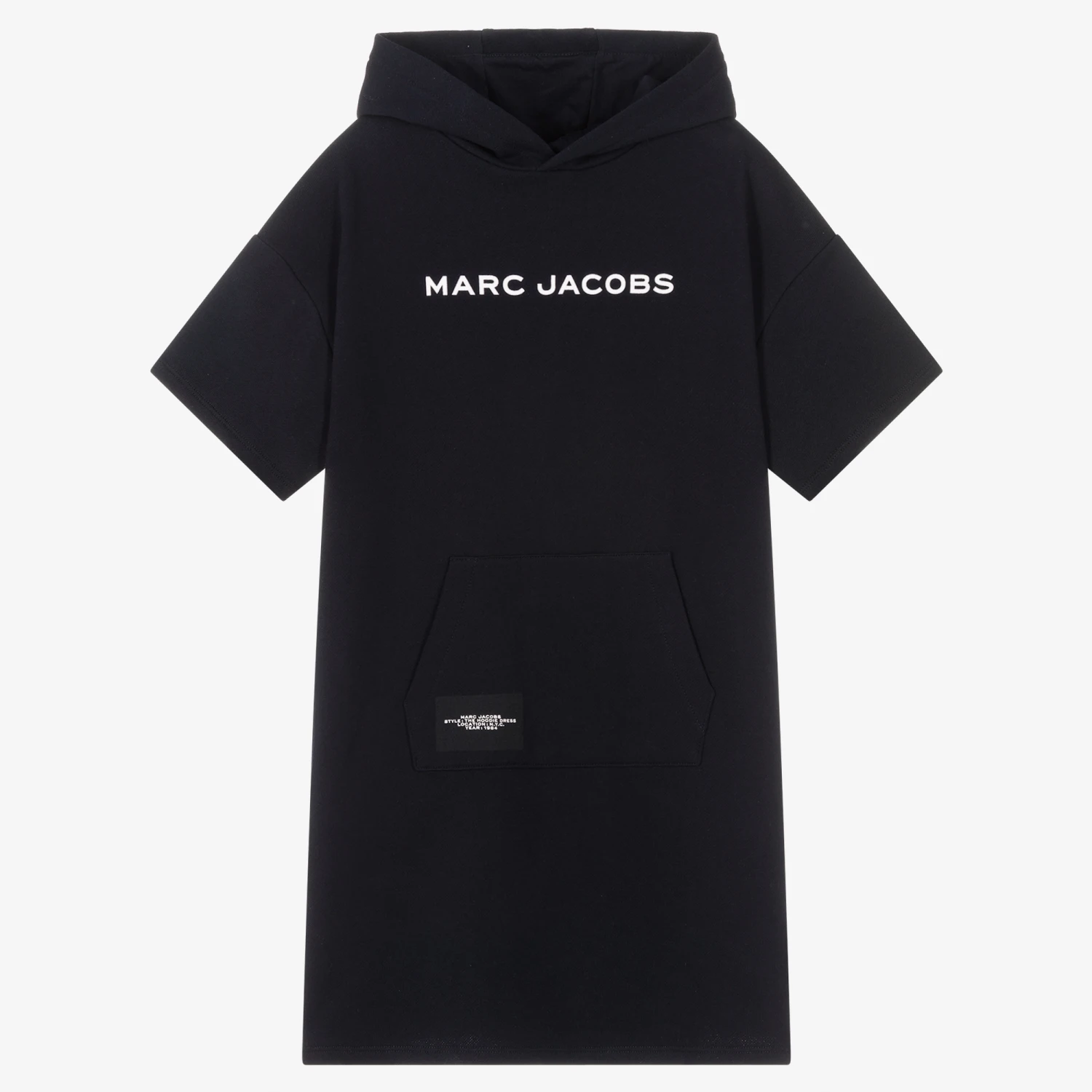 Navy blue hoodie dress for teen girls by American brand MARC JACOBS, as seen in the main collection. It is made in stretchy cotton sweatshirt jersey, with a contrast white logo graphic across the front. A cool black box logo is stamped on the front pocket for a little extra designer appeal.