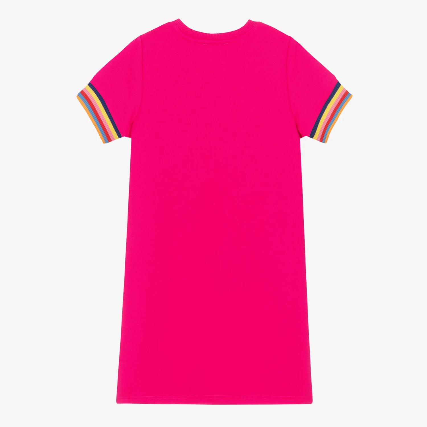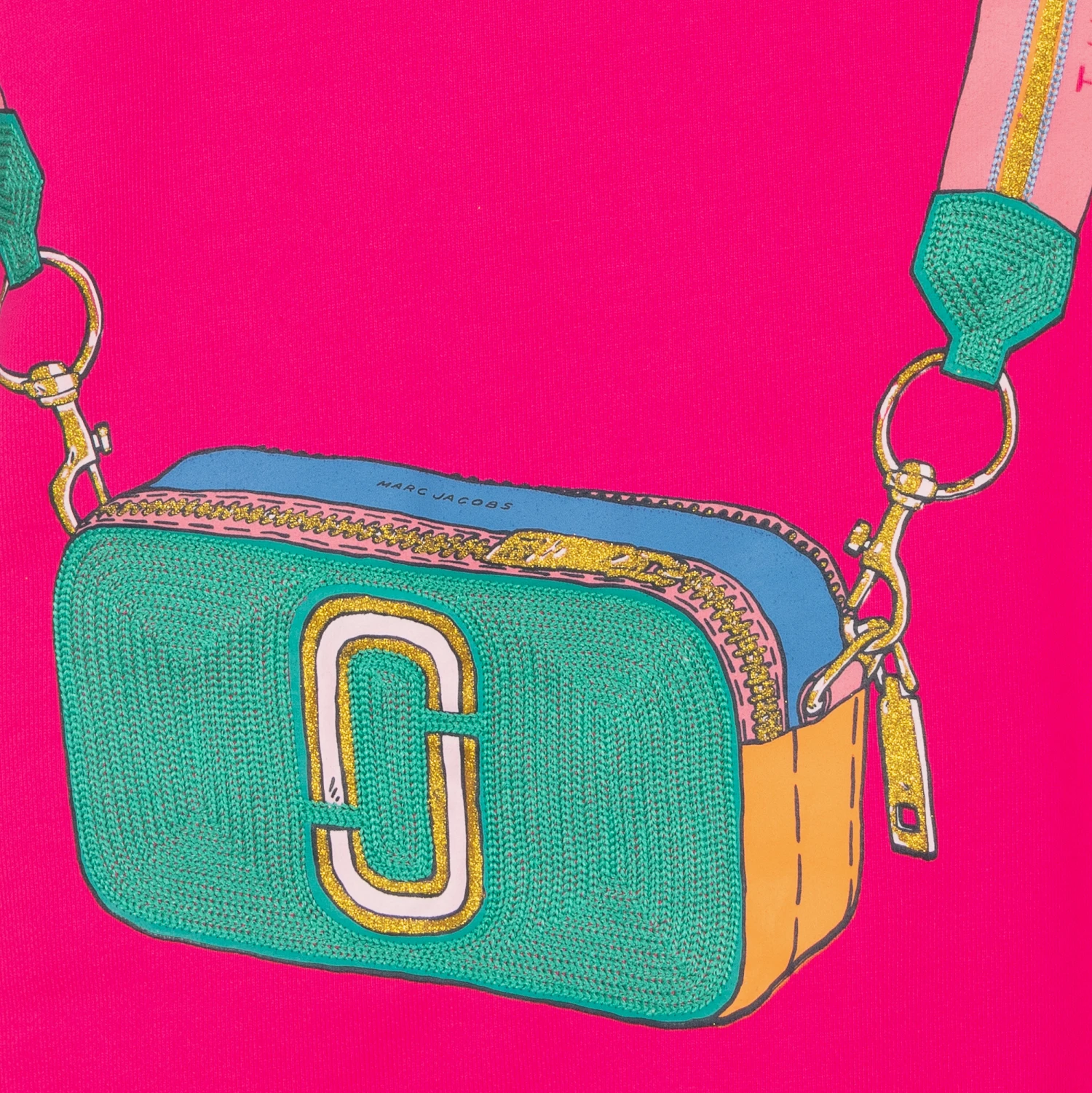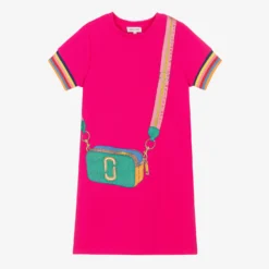 Bright neon pink dress for teen girls by MARC JACOBS, with the brand’s iconic ‘Snapshot’ bag printed on the front. Made in mid-weight cotton blend jersey, this casual, designer dress features the distinctive ‘Double-J’ logo. The multicoloured, ribbed cuffs add a playful splash of colour.