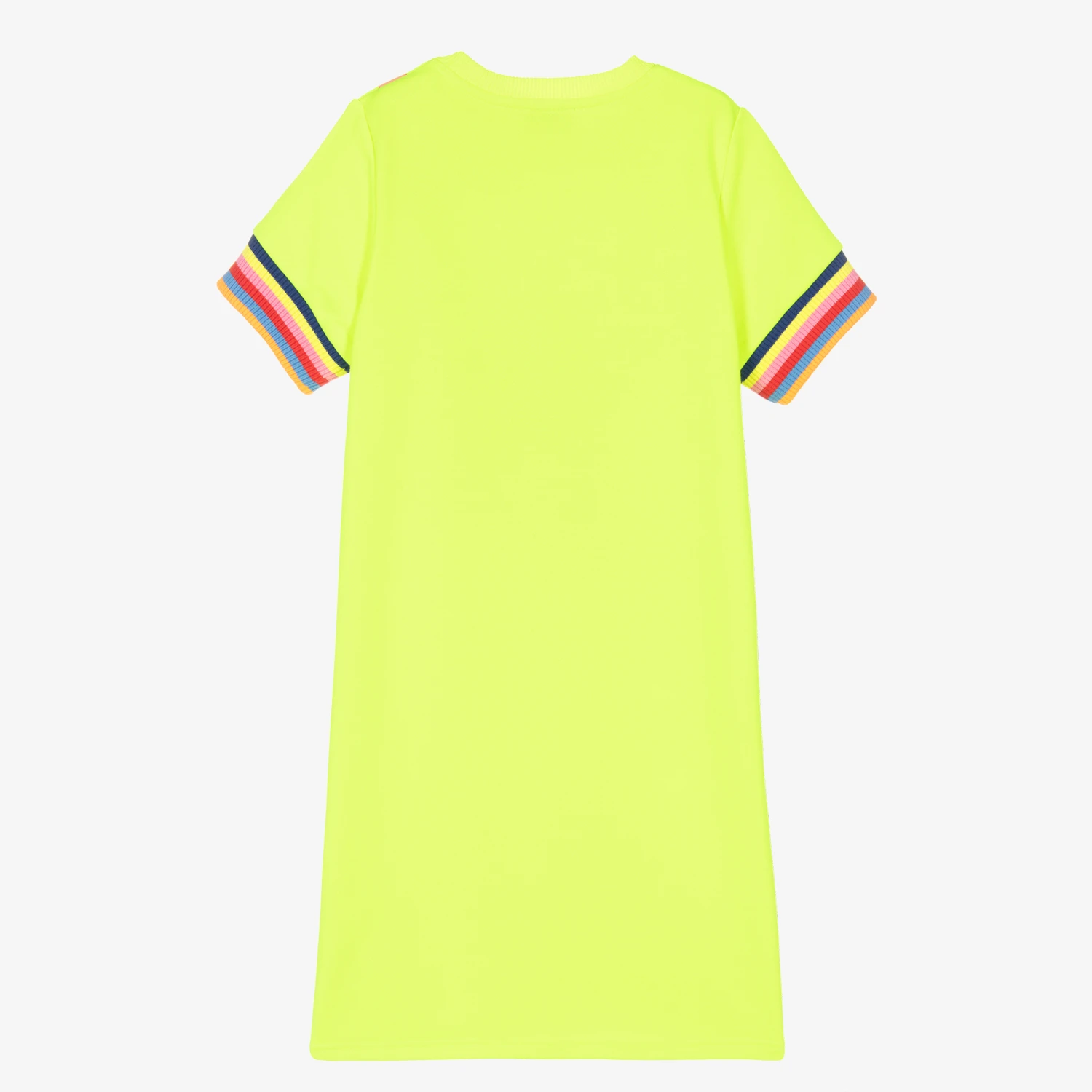 Teen girls striking neon yellow dress by MARC JACOBS, with a contemporary twist. The front is printed with a colourful trompe l’oeil belt bag artwork, featuring a useful zip for storing mini essentials. In a relaxed T-shirt style, it has multi-coloured ribbed striped cuffs and is made in soft mid-weight jersey for casual comfort.
