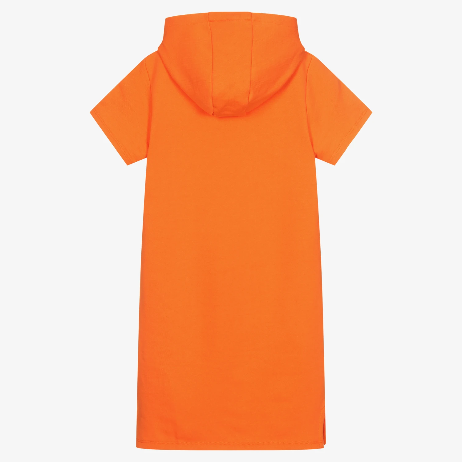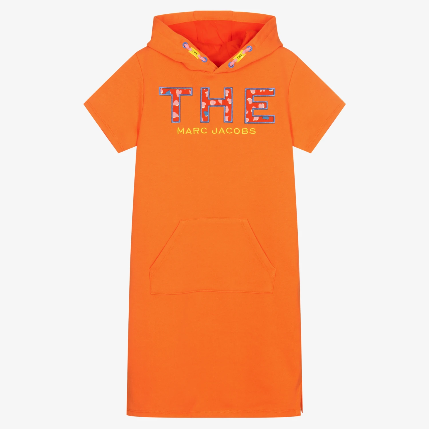 Orange hoodie dress for teen girls by THE MARC JACOBS, embroidered with a bold red and blue heart logo on the front. Made in soft cotton sweatshirt jersey for comfort, it has a casual front pouch pocket, and a pink and yellow faux drawstring on the hood.