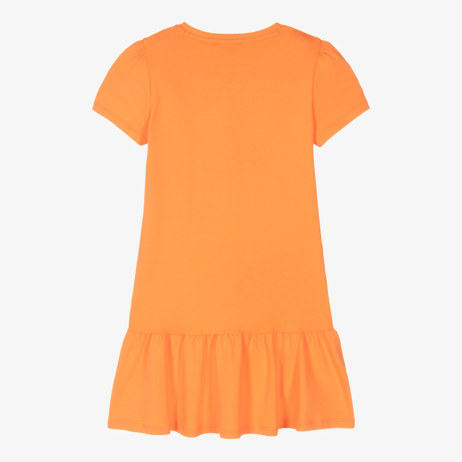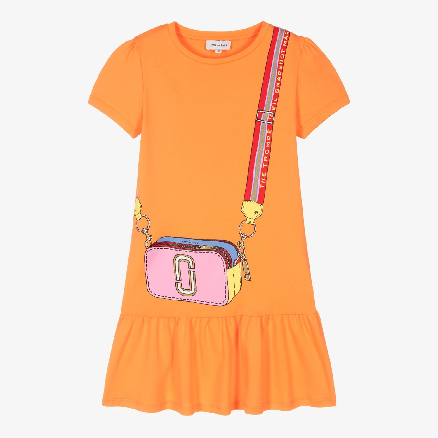 From American brand MARC JACOBS, an orange dress for teen girls printed with the iconic ‘Snapshot’ bag for a designer finish. It has a lightly frilled drop hem for volume and a feminine silhouette, whilst the soft cotton jersey is comfortable.