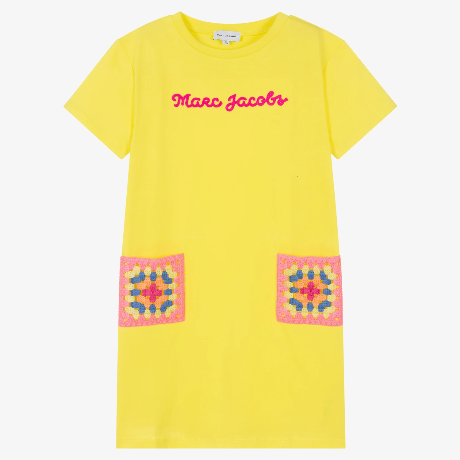 A bright yellow dress for teen girls by MARC JACOBS, with a fuchsia pink embroidered logo on the front. Making an instant style statement, this casual dress has fun, multicoloured crocheted pockets on the front. Soft and easy wearing, this classic T-shirt style dress is made in comfortable cotton jersey.