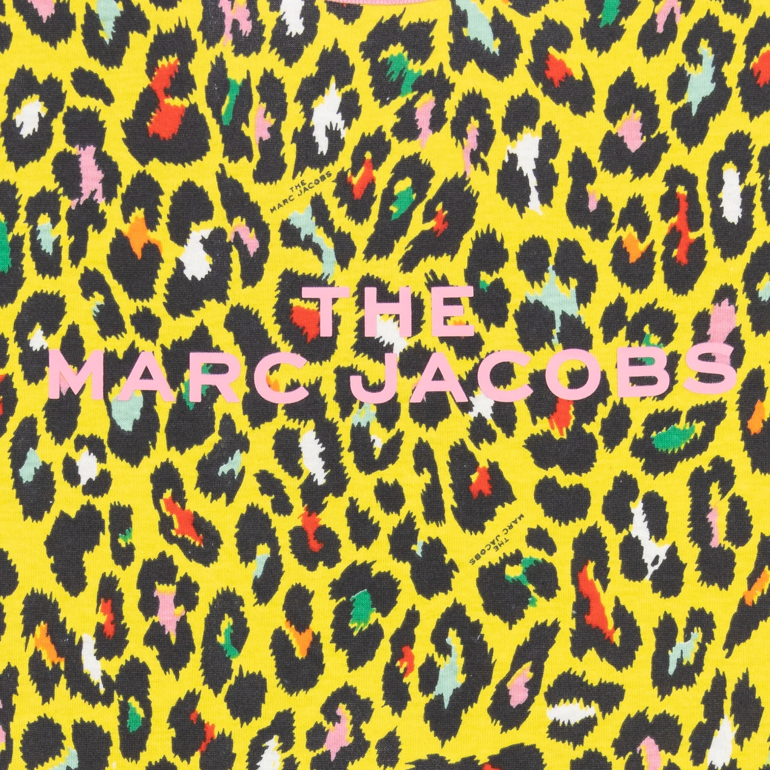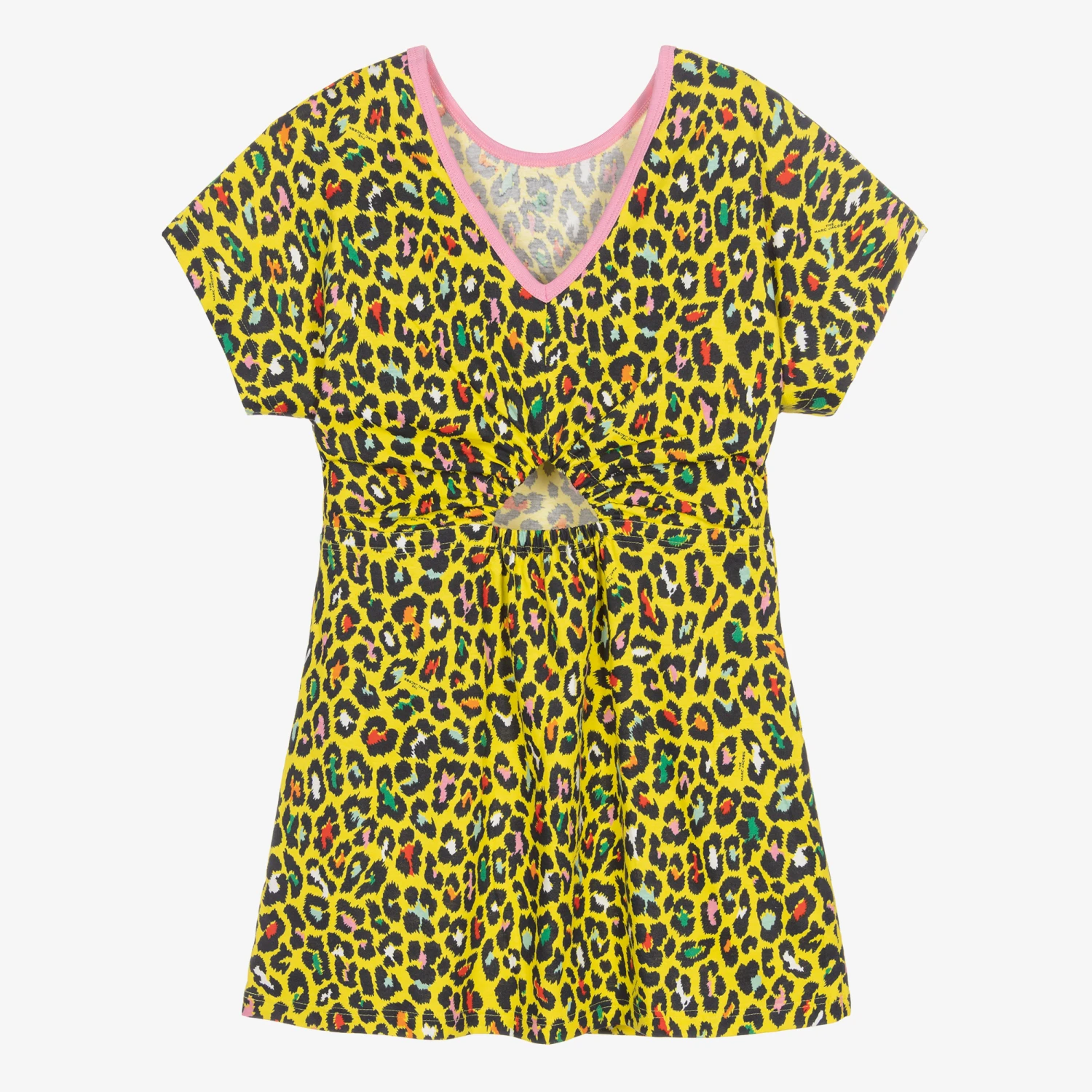 Teen girls yellow animal print dress by THE MARC JACOBS, as seen in the main collection. Made in soft, stretchy organic cotton jersey, there is a pale pink logo print on the bodice. This cheetah print dress has front pockets, a contrasting pink ribbed collar trim and an elasticated waist. It has a deep scooped back with elasticated cut-out detailing.