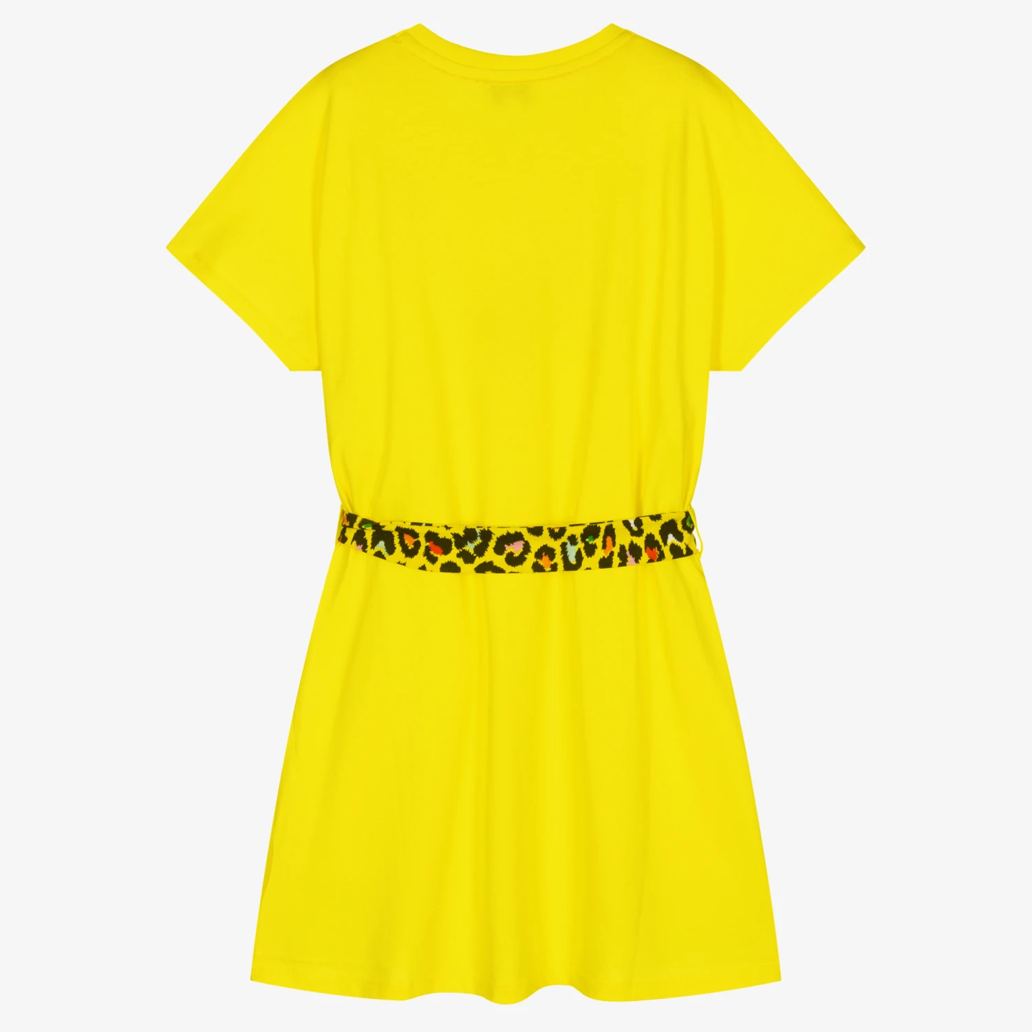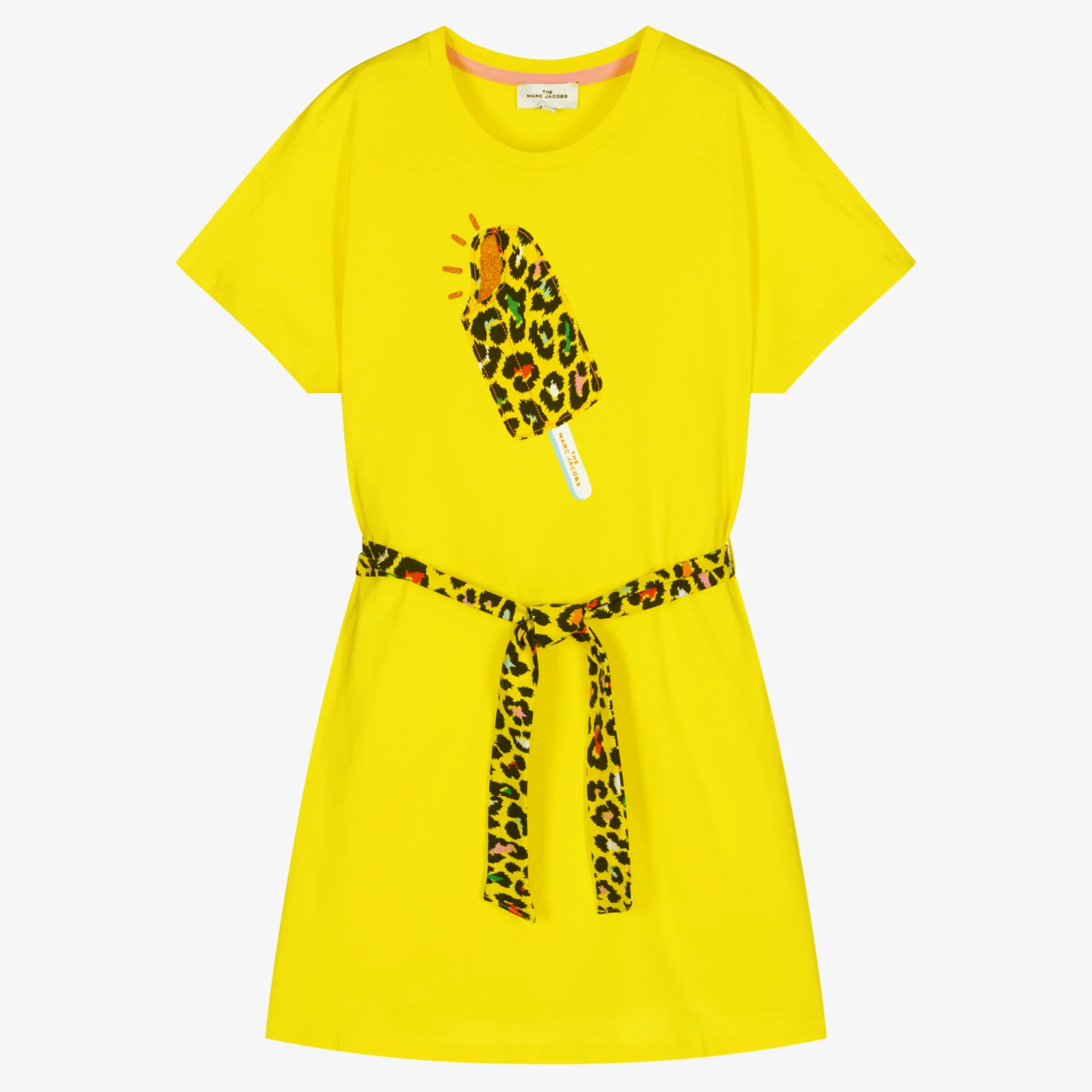 Yellow organic cotton T-shirt dress for teen girls by THE MARC JACOBS, with a cheetah print belt. On the front the dress has a large appliqué of an ice lolly in a matching cheetah pattern with glittery orange accents.