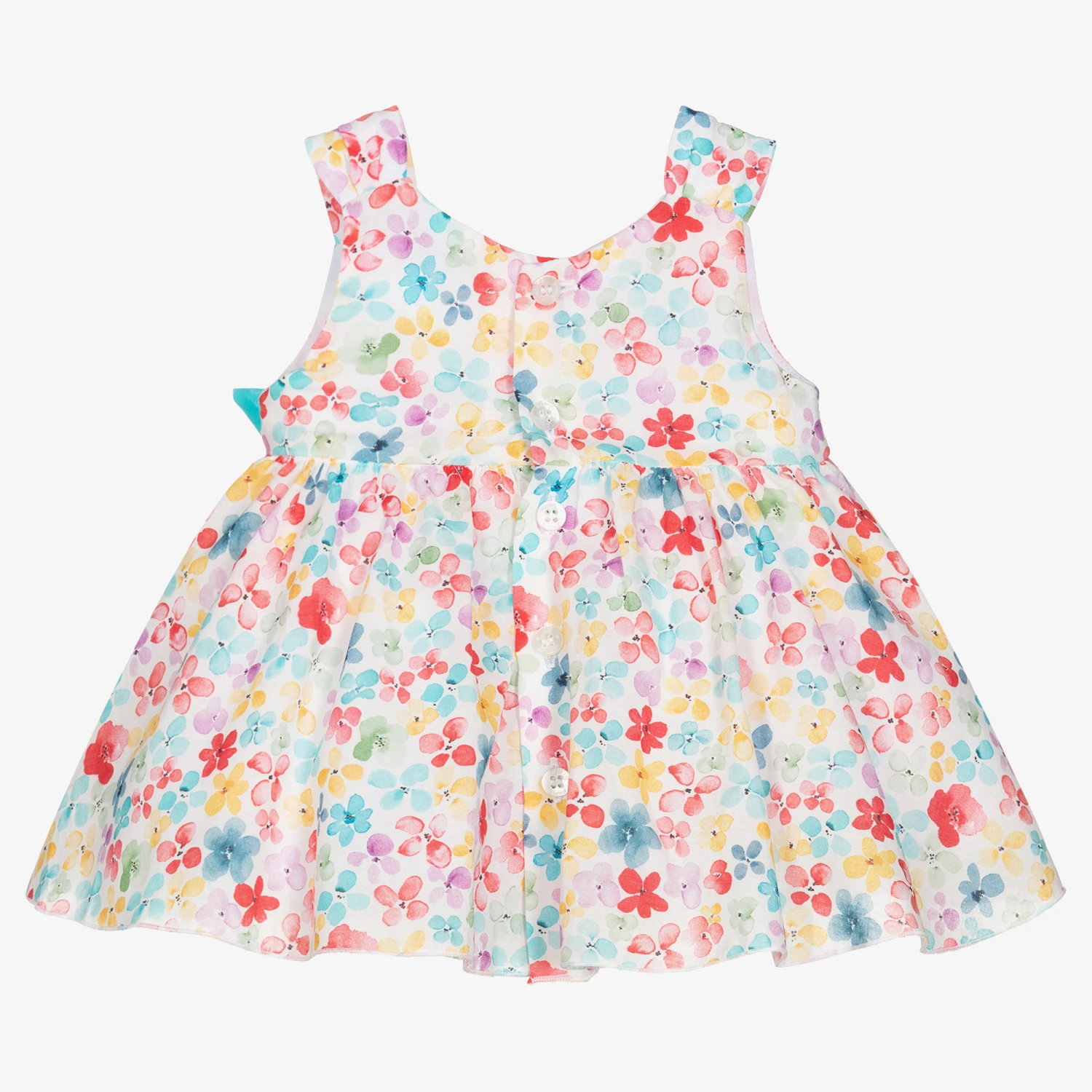 White floral dress for baby girls by Spanish brand Mayoral, made in soft and lightweight cotton. A sweet summery piece, it has a crossover front, and a turquoise blue bow on the chest. Fully lined, it is designed in a colourful floral print with a gathered waist and button fastenings on the back. It comes with matching knickers, which are elasticated on the waist and leg for easy, comfortable wear.