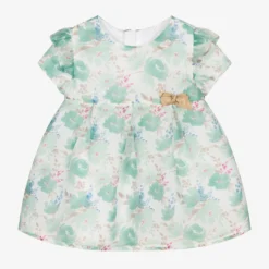 Lovely for a special occasion, a white and green floral Mayoral dress for baby girls. It is made in sheer, textured organza, with ruffle-trimmed capped sleeves, box pleats on the skirt, and a gold grosgrain bow on the waistline for a pretty finish. Lined in lightweight cotton for comfort, it fastens discreetly with a concealed zip on the back and comes with matching knickers to complete the look.