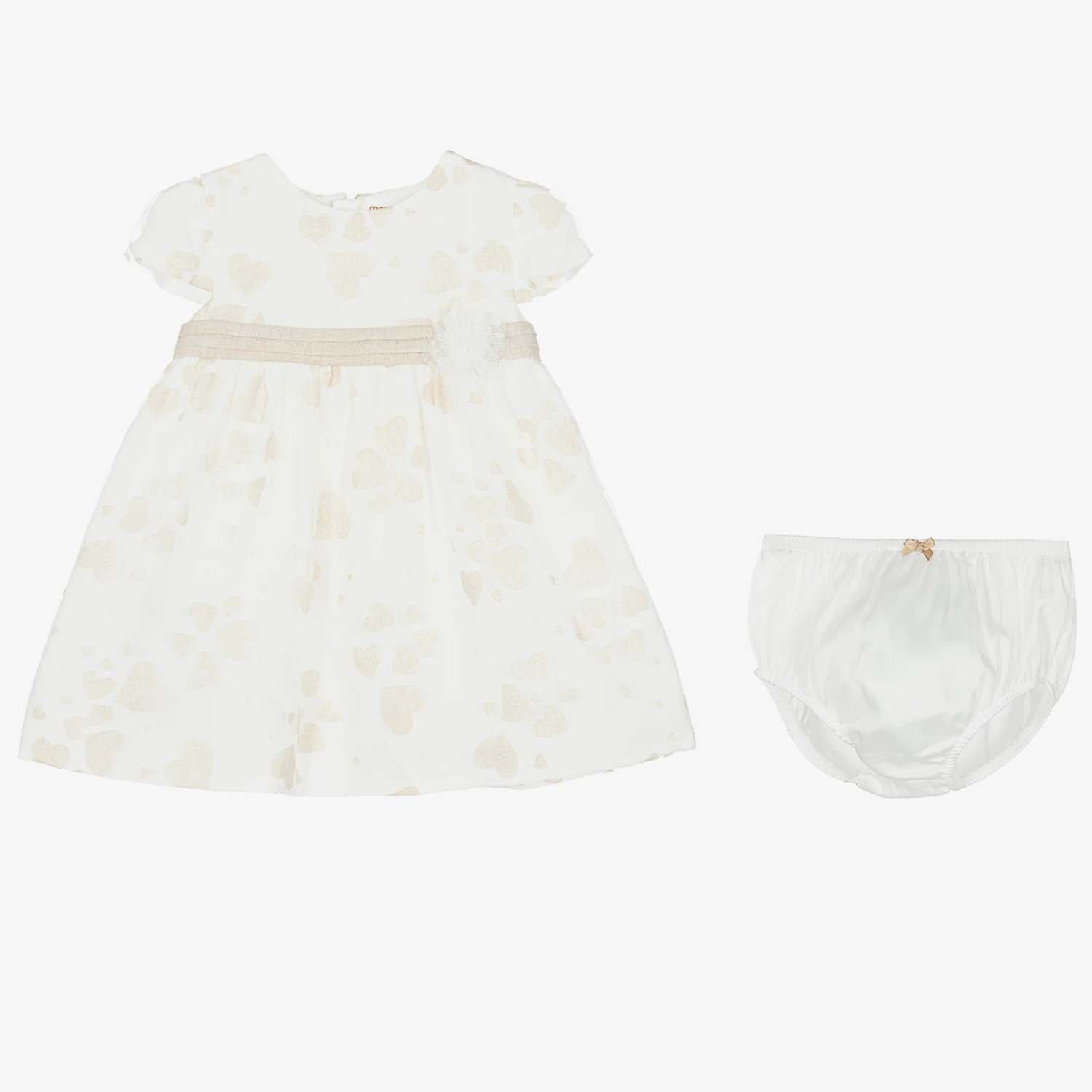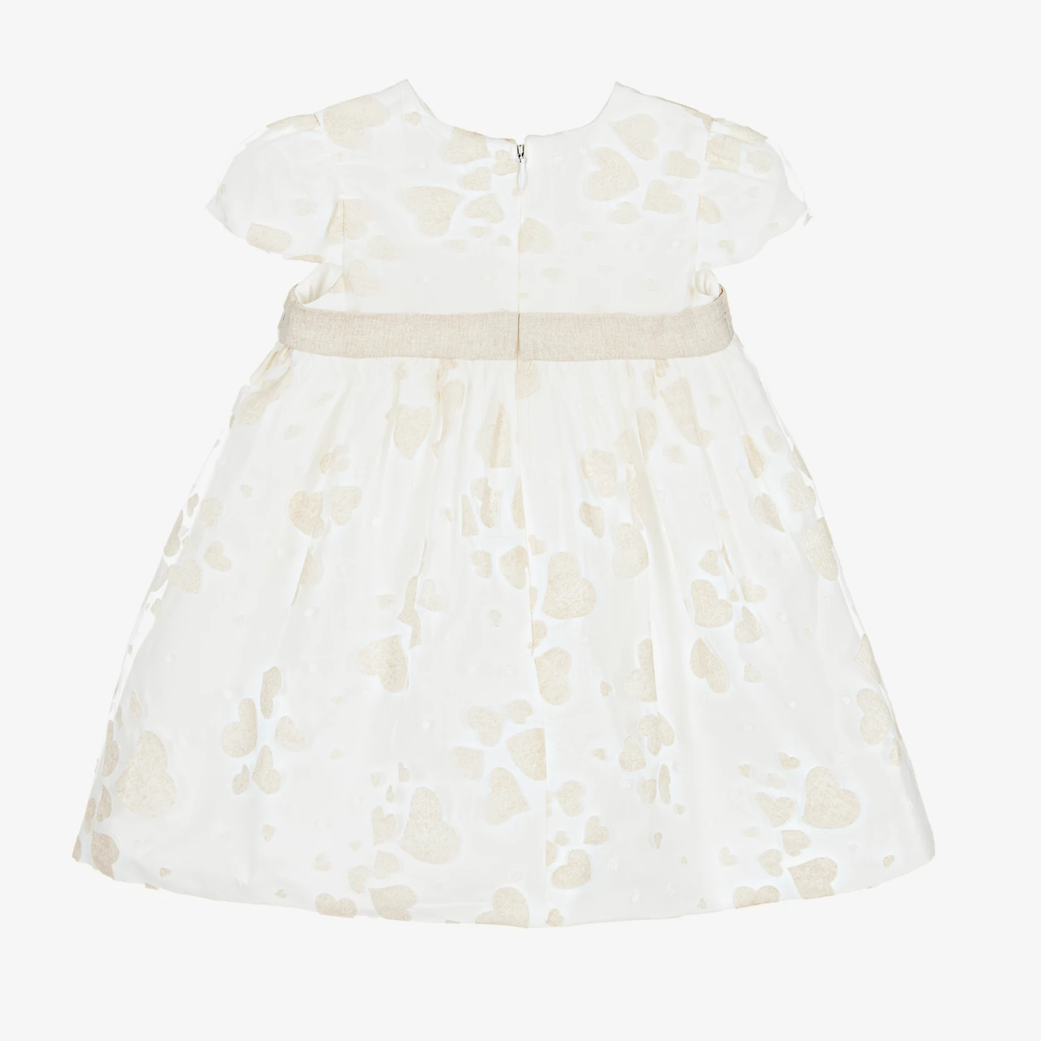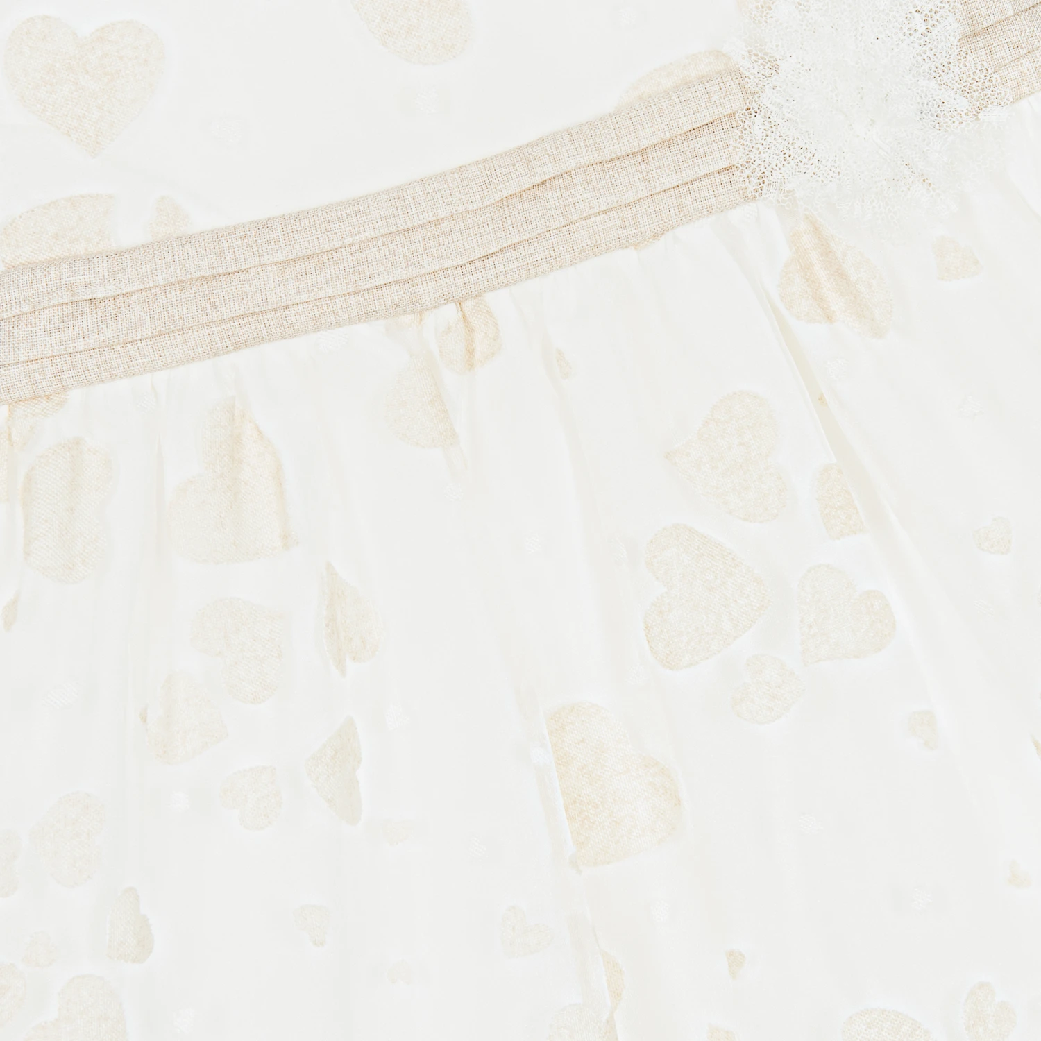 Ivory special occasion dress for baby girls by Spanish brand Mayoral, made in a soft cotton and linen blend with a soft tulle overlay. Patterned in a beige heart design, it has pretty puffed sleeves and a fixed beige sash with a tulle flower appliqué. There is a concealed zip fastening on the back for a neat finish. The dress comes with silky soft knickers, which have a beige grosgrain ribbon bow on the elasticated waistband.