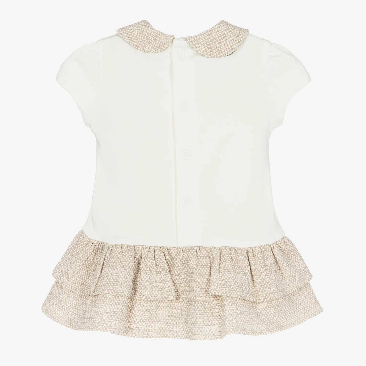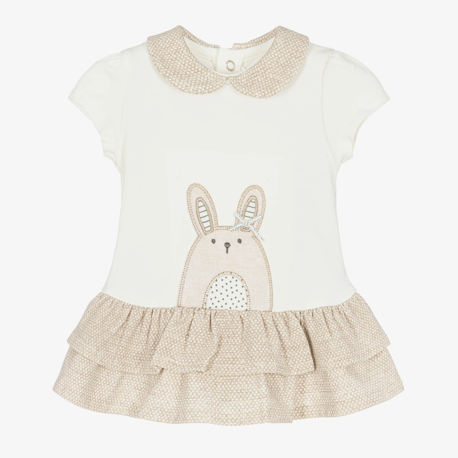 A cute ivory and beige sustainable cotton jersey dress for baby girls by Mayoral. Soft and stretchy, there is a sweet rounded linen blend collar, an embroidered bunny motif and a ruffle hem, with popper fastenings on the back for easy dressing.