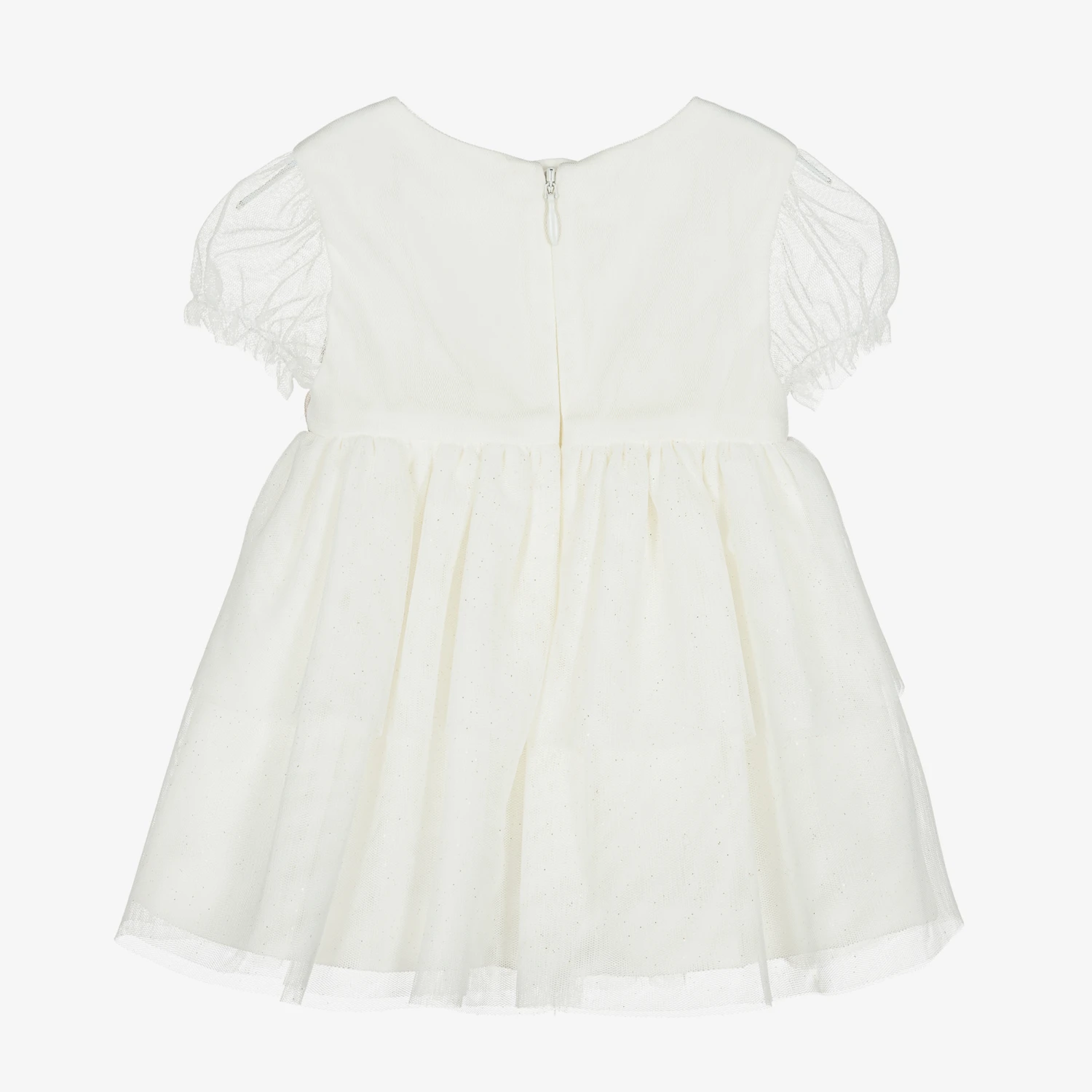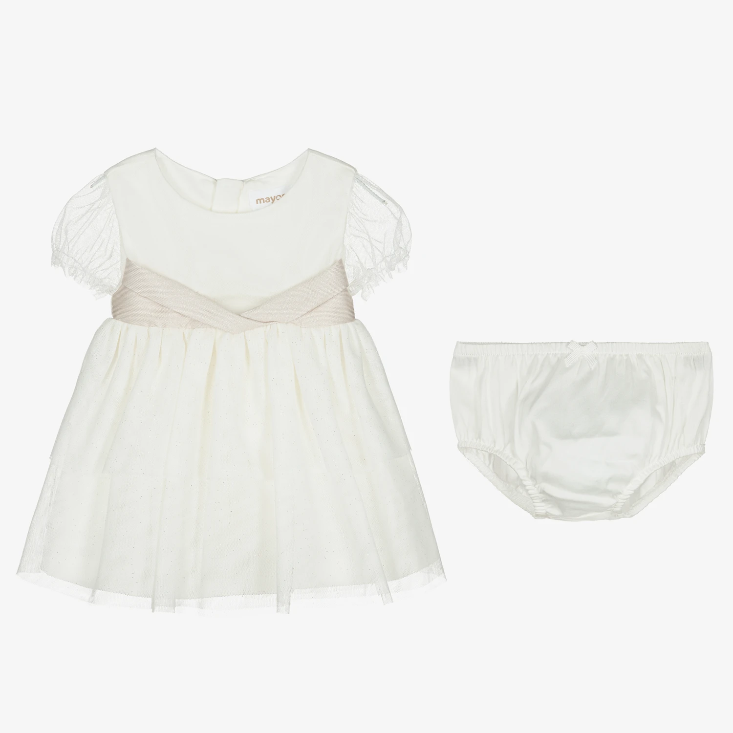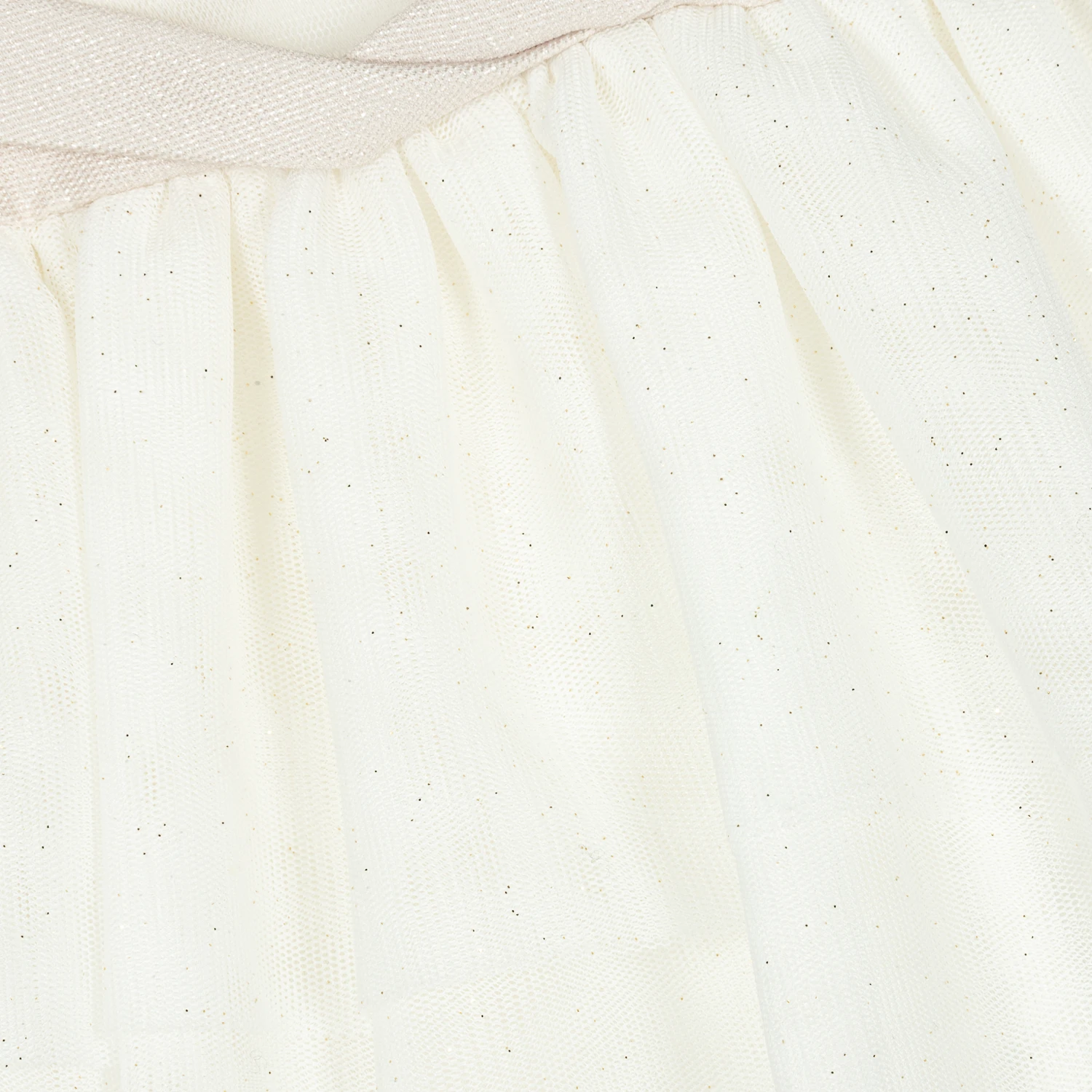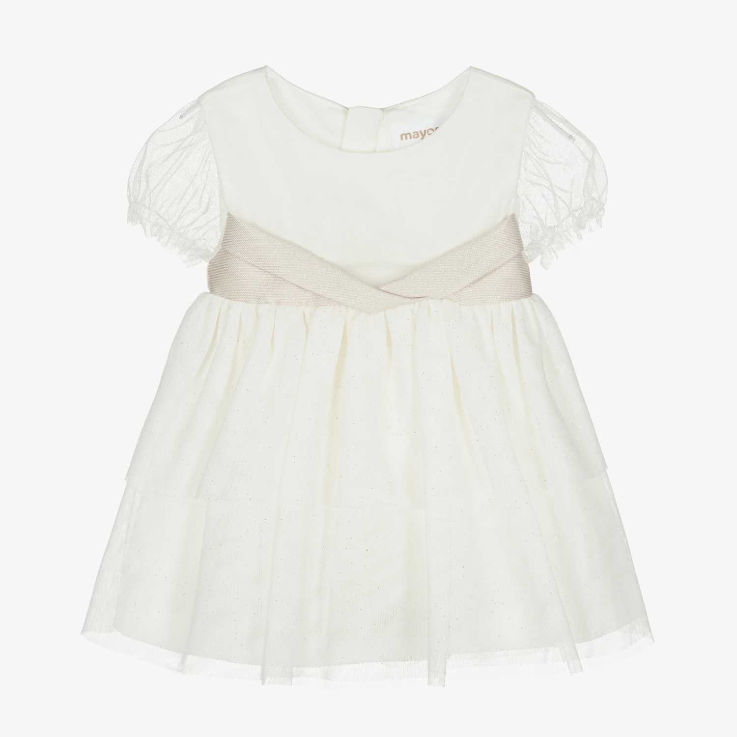 Ivory special occasion dress for baby girls by Spanish brand Mayoral, made in layers of tulle with a soft voile lining. Pretty and girly, it has sheer puff sleeves, a twisted gold waistband, and a tiered skirt which shimmers with gold glitter. There is a zip fastening on the back and it comes with matching knickers, which have a grosgrain bow on the elasticated waistband.
