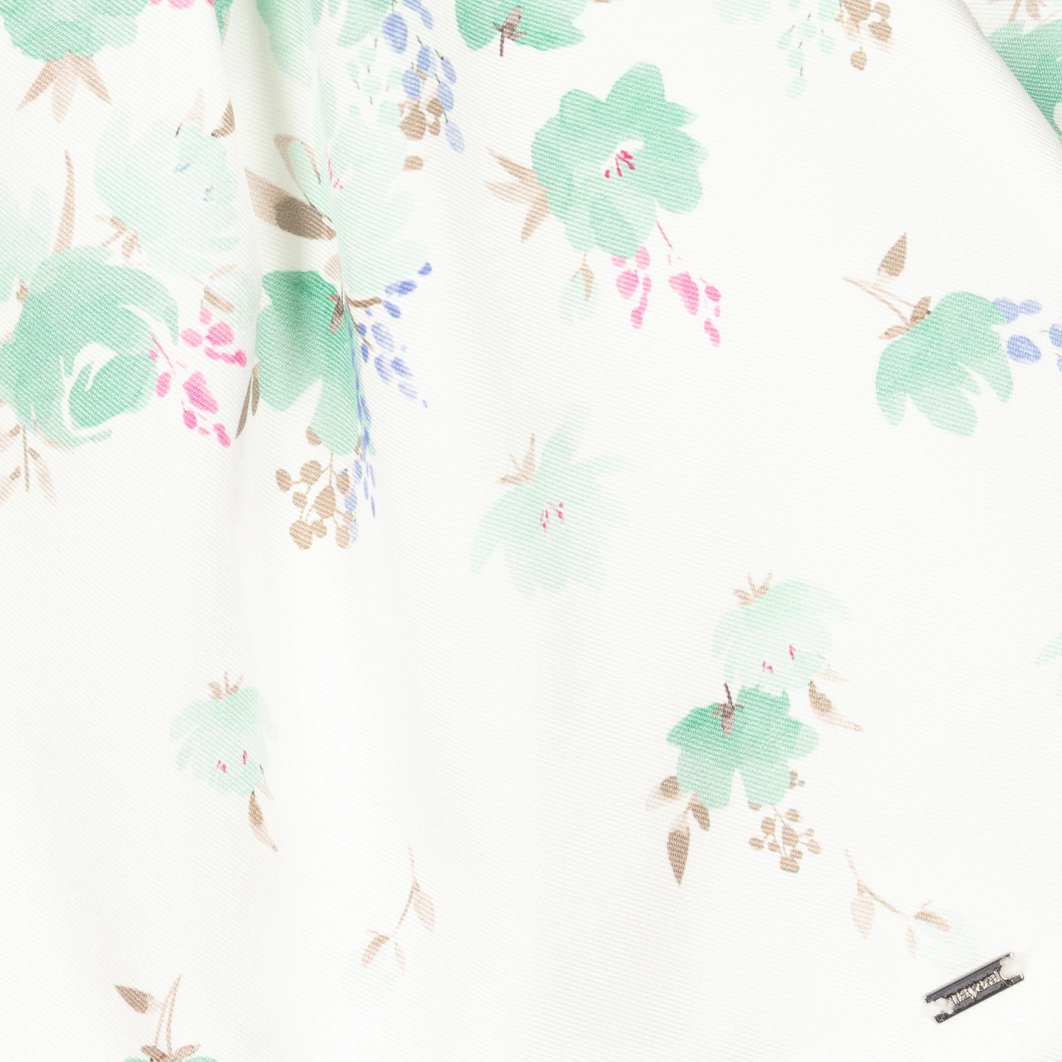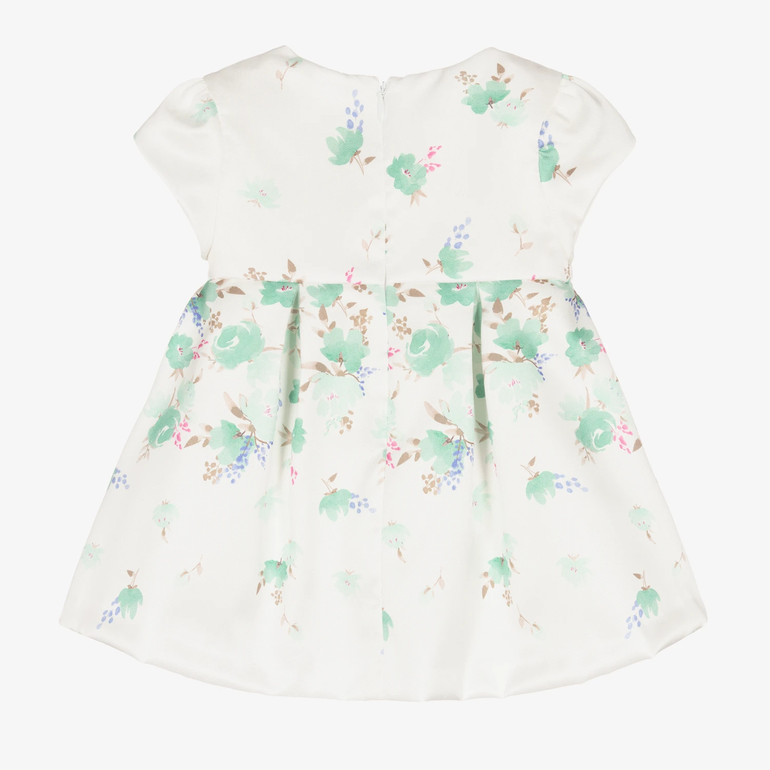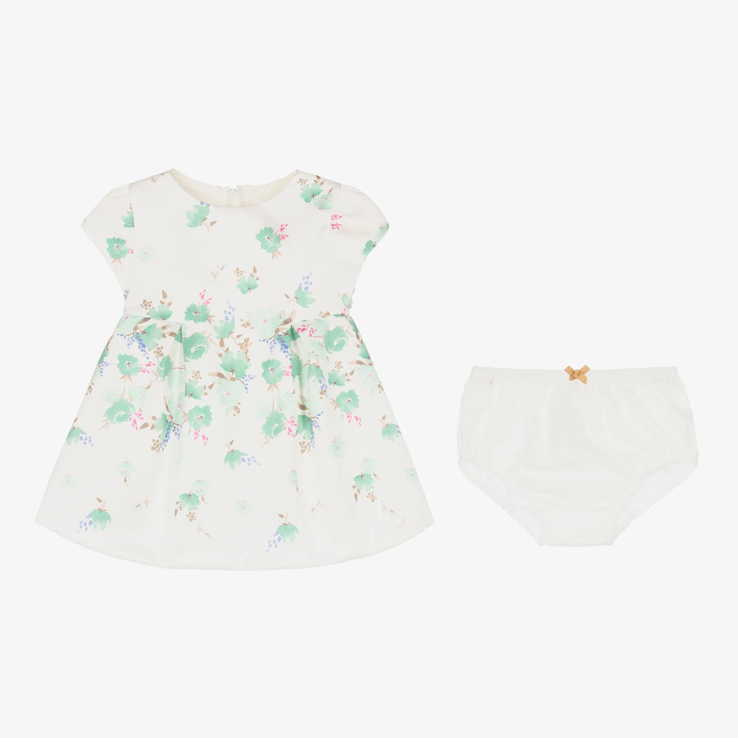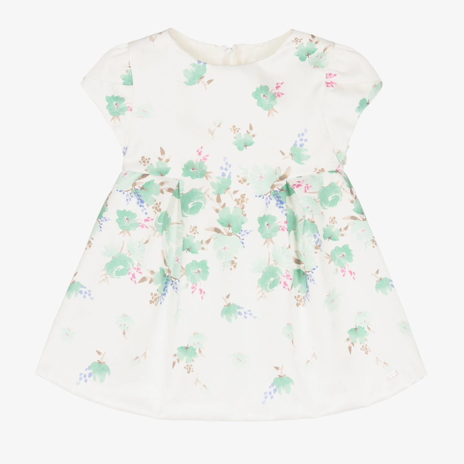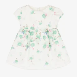 Ivory and green floral Mayoral dress for baby girls, lovely for a special occasion. Made in soft satin twill, this classic style has pretty tulip sleeves and box pleats on the skirt for a feminine silhouette. It is comfortably lined in lightweight cotton and fastens with a concealed zip on the back. The brand’s metal logo plate can be found on the front hem and the dress comes with lightweight cotton knickers to complete the look.