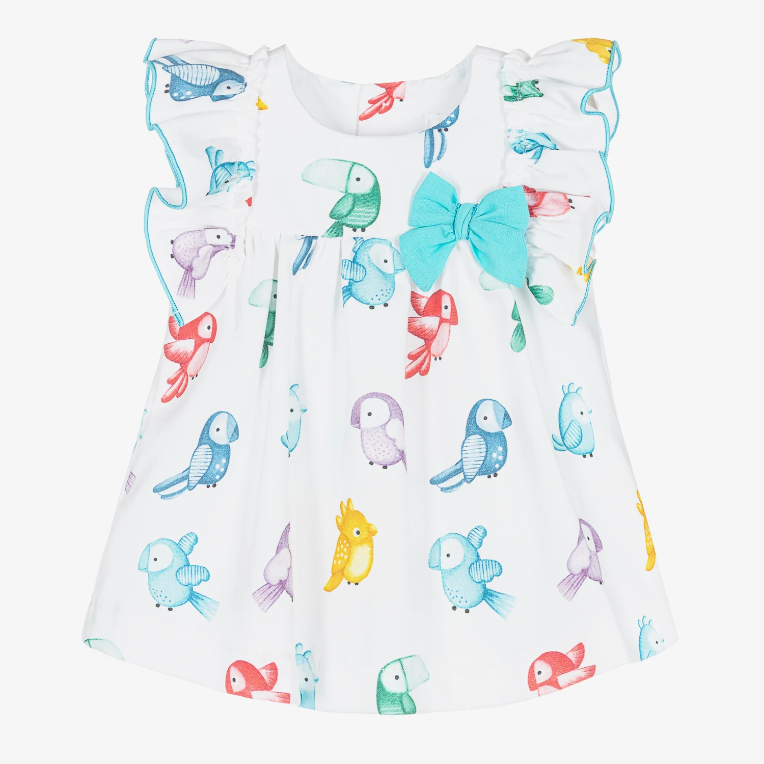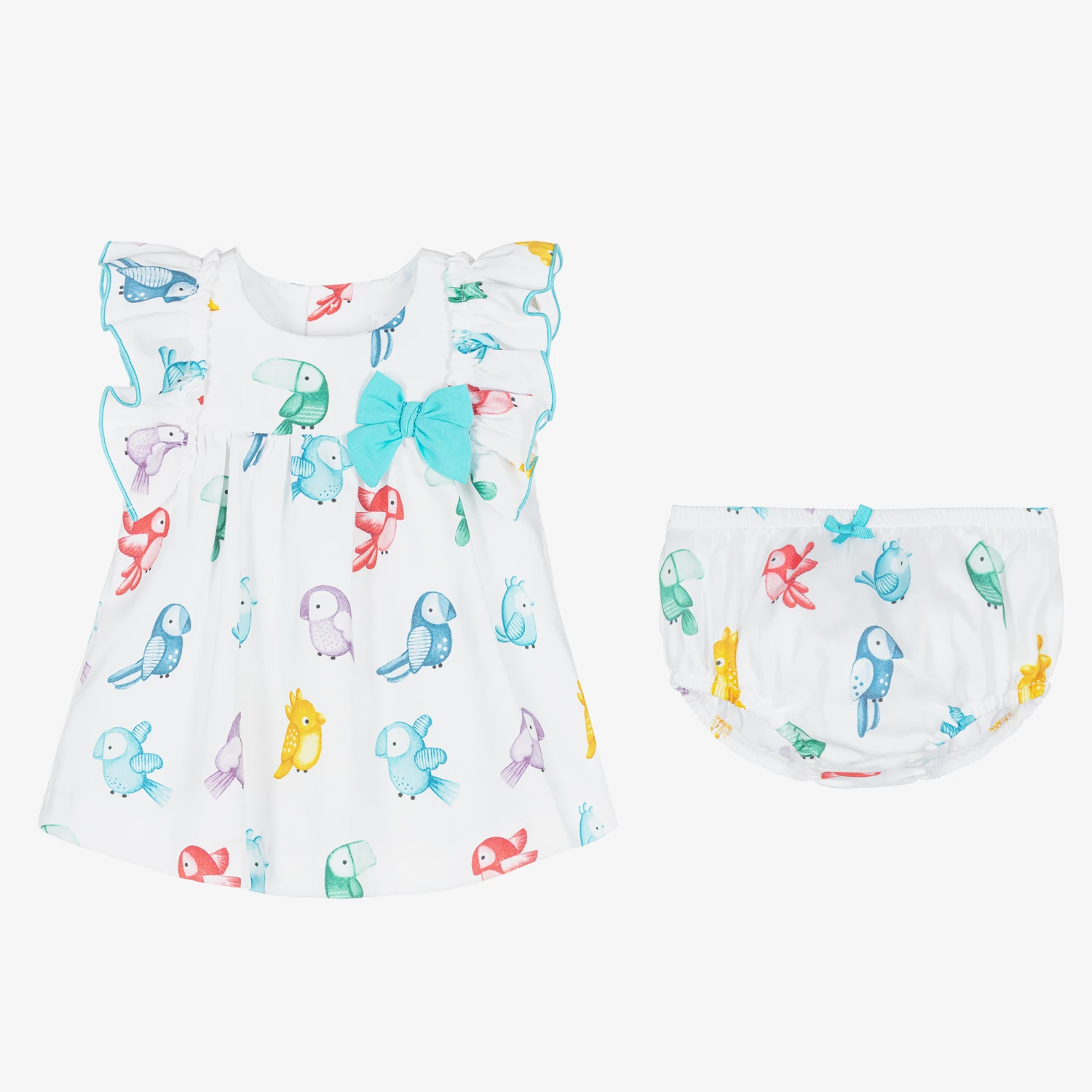 A lovely white cotton dress for baby girls by Spanish brand Mayoral. In a fun and colourful parrot design, it has ruffled sleeves and a blue bow trim on the chest. A charming choice for warmer days, the dress is complete with back button fastenings and a full cotton voile lining for added comfort. It comes with a pair of matching knickers with elasticated trims for easy wear.