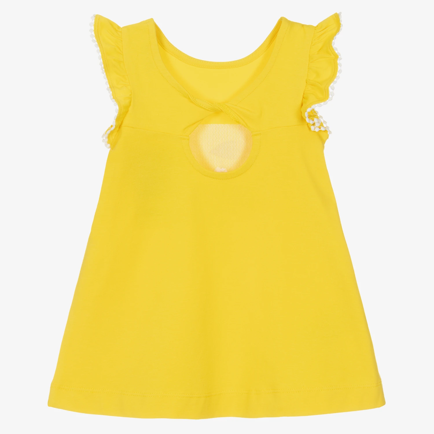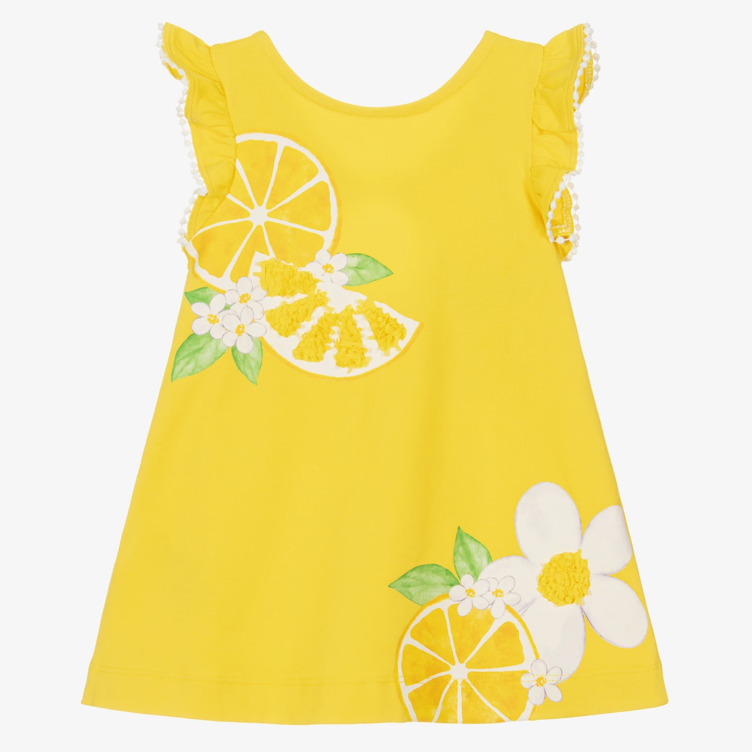 Vibrant yellow dress for little girls by Spanish brand Mayoral, made in soft and breathable, sustainable cotton jersey. It has a fun lemon and flower print decorated with softly ruffled voile appliqués. There is a twisted, open back detail and white embroidered trimmed ruffle sleeves.