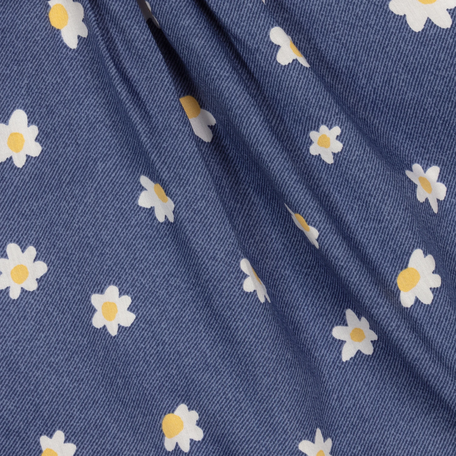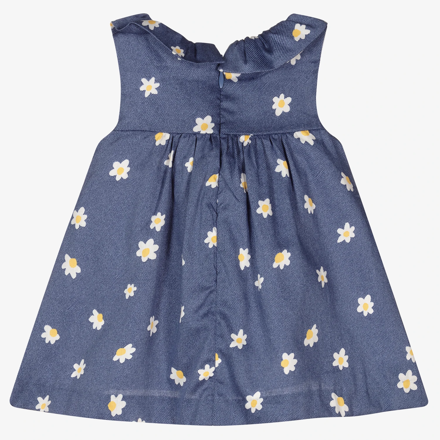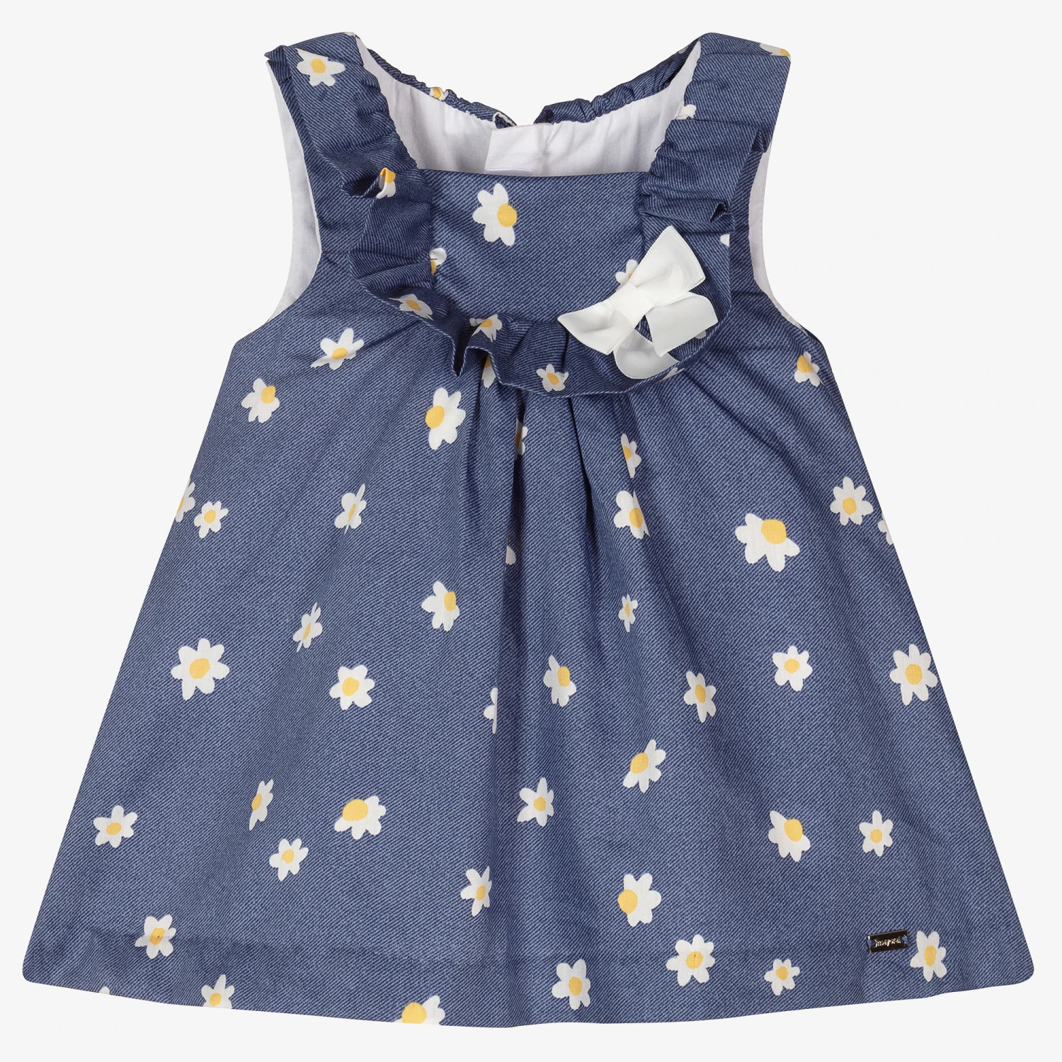 Pretty blue dress set for baby girls by Mayoral Newborn, made in soft, lightweight cotton, with a sweet white and yellow daisy pattern. Fully lined, it has a ruffle trim, with a white bow on the front. The matching knickers have a ruffle trim around the leg openings and a white bow on the elasticated waistband.
